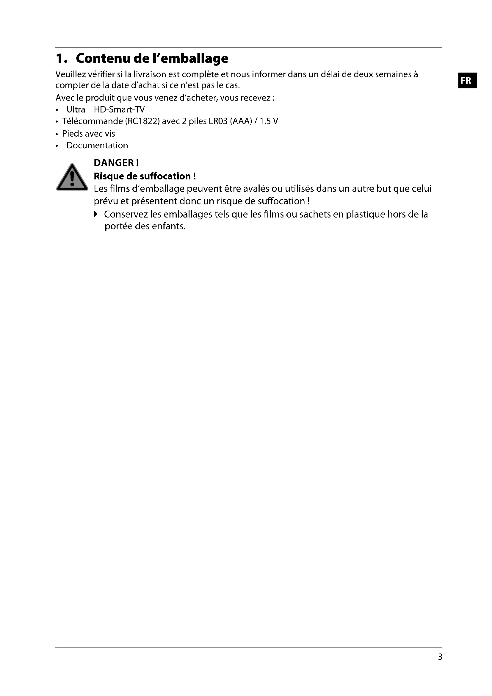 Avant de mettre l‘appareil en marche, lisez impérativement les « Consignes de sécurité ». 3.1. Déballage Avant le déballage, choisissez un endroit adapté pour l’installation de l’appareil. Ouvrez le carton avec précaution pour éviter d’endommager l’appareil, par exemple avec un couteau à longue lame. L’emballage contient différentes petites pièces (piles, etc.). Conservez-les hors de la portée des enfants : ils pourraient s’étouffer ! Conservez soigneusement les emballages et utilisez uniquement ceux-ci pour transporter le té- léviseur. DANGER ! Risque de suffocation ! Les films d’emballage peuvent être avalés ou utilisés dans un autre but que celui prévu et présentent donc un risque de suffocation ! Conservez les emballages tels que les films ou sachets en plastique hors de la portée des enfants. MD31451-5 ML eCom QSG 30031191_3_5_7_9 Final.indb 8MD31451-5 ML eCom QSG 30031191_3_5_7_9 Final.indb 8 13.01.2021 14:54:3313.01.2021 14:54:33FR