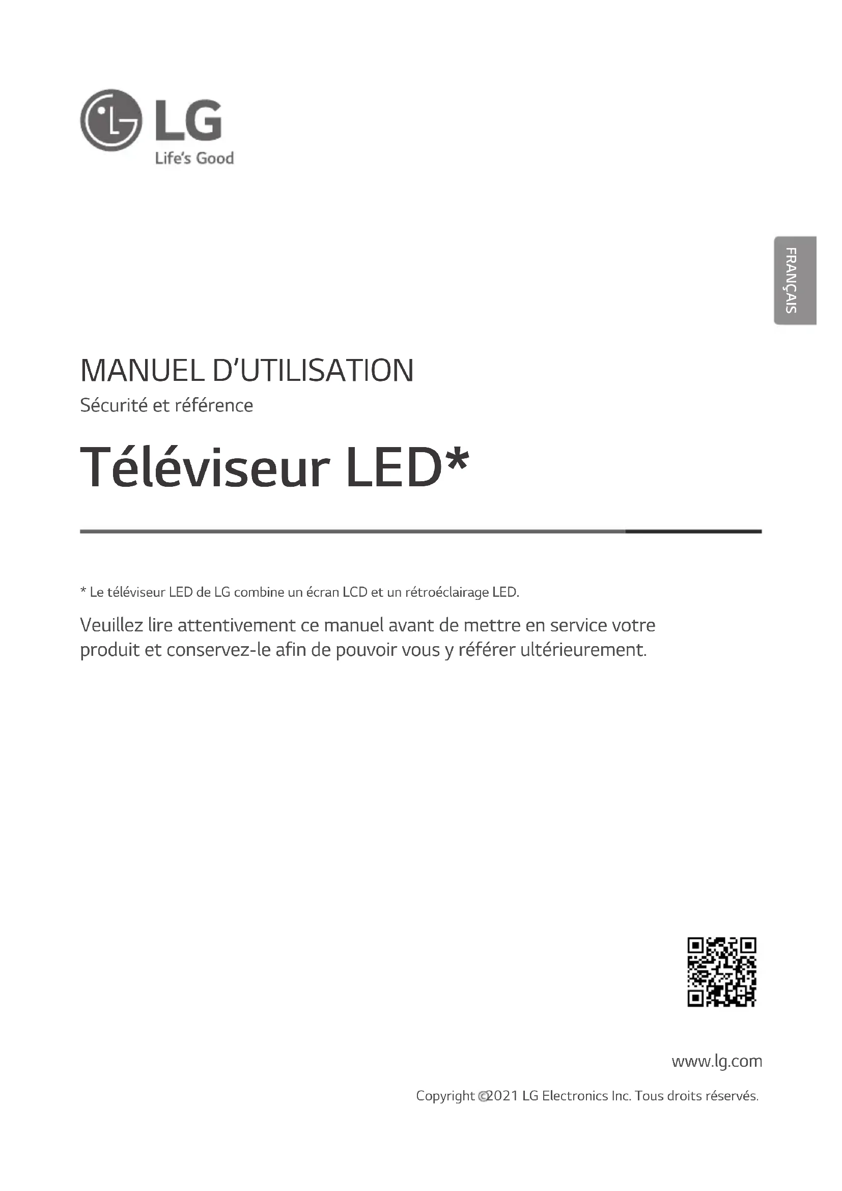 Veuillez lire attentivement ce manuel avant de mettre en service votre produit et conservez-le afin de pouvoir vous y référer ultérieurement. www.lg.com Copyright 2021 LG Electronics Inc. Tous droits réservés.