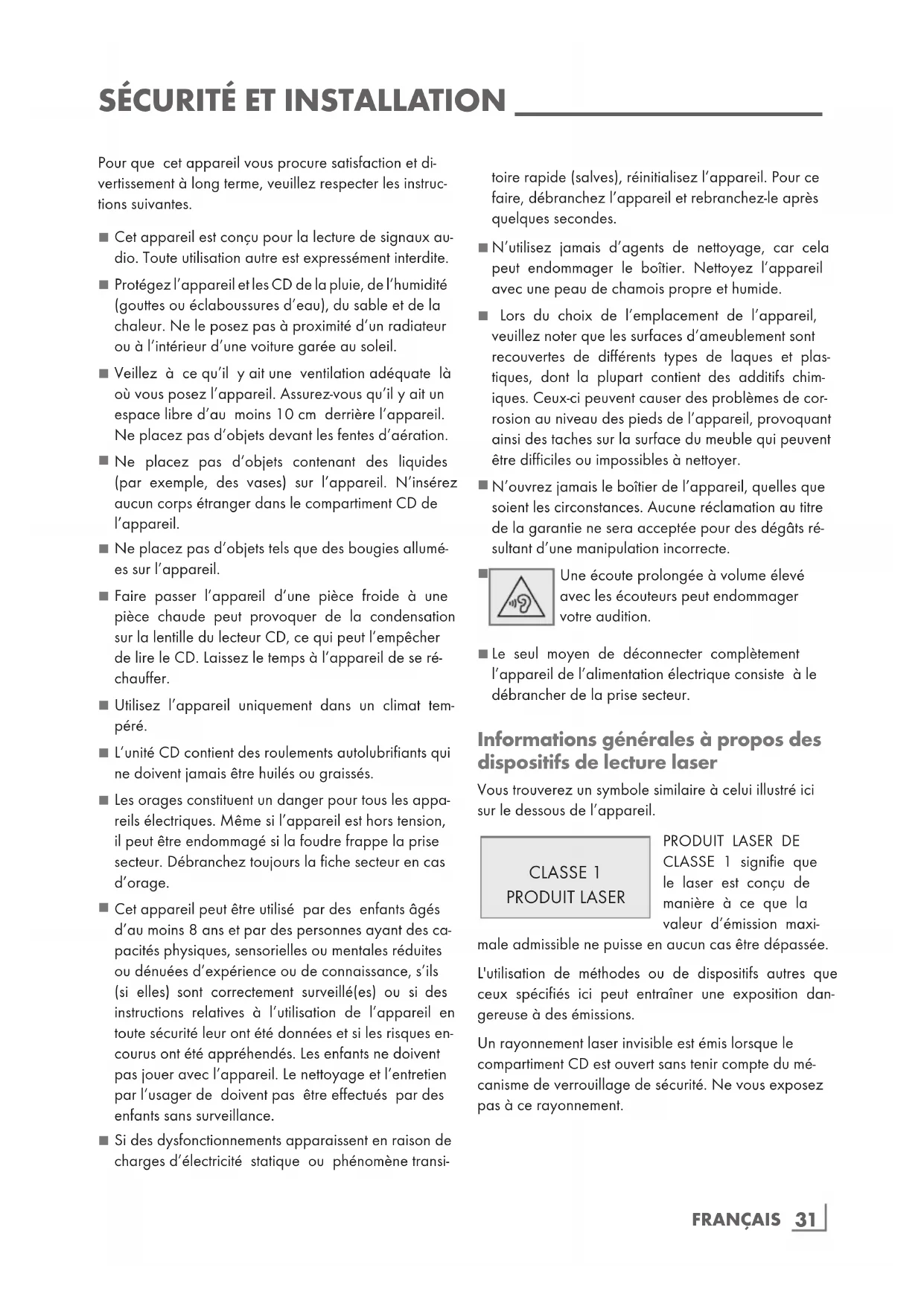 CLASSE 1 signifie que le laser est conçu de manière à ce que la valeur d’émission maxi- male admissible ne puisse en aucun cas être dépassée. L'utilisation de méthodes ou de dispositifs autres que ceux spécifiés ici peut entraîner une exposition dan- gereuse à des émissions. Un rayonnement laser invisible est émis lorsque le compartiment CD est ouvert sans tenir compte du mé- canisme de verrouillage de sécurité. Ne vous exposez pas à ce rayonnement. Pour que cet appareil vous procure satisfaction et di- vertissement à long terme, veuillez respecter les instruc- tions suivantes.