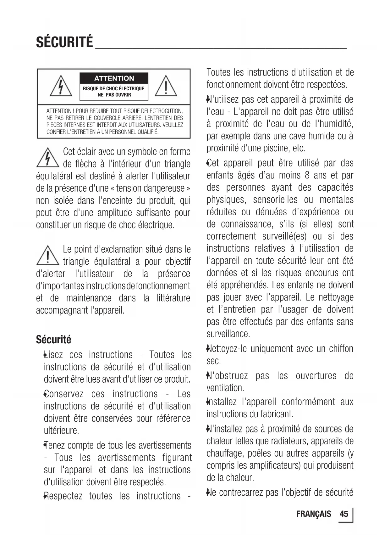Ne contrecarrez pas l’objectif de sécurité ATTENTION ATTENTION! POUR REDUIRE TOUT RISQUE DELECTROCUTION, NE PAS RETIRER LE COUVERCLE ARRIERE. LENTRETIEN DES PIECES INTERNES EST INTERDIT AUX UTILISATEURS. VEUILLEZ CONFIER L’ENTRETIEN A UN PERSONNEL QUALIFIÉ.RISQUE DE CHOC ÉLECTRIQUE NE PAS OUVRIR46 FRANÇAIS SÉCURITÉ __________________________________ de la fiche polarisée ou de la fiche de terre. Une fiche polarisée a deux lames dont l'une est plus large que l'autre. Une fiche de terre a deux lames et une troisième broche de mise à la terre. La lame large ou la troisième broche est prévue pour votre sécurité. Si la fiche fournie ne s'adapte pas à votre prise de courant, consultez un électricien pour remplacer la prise obsolète.