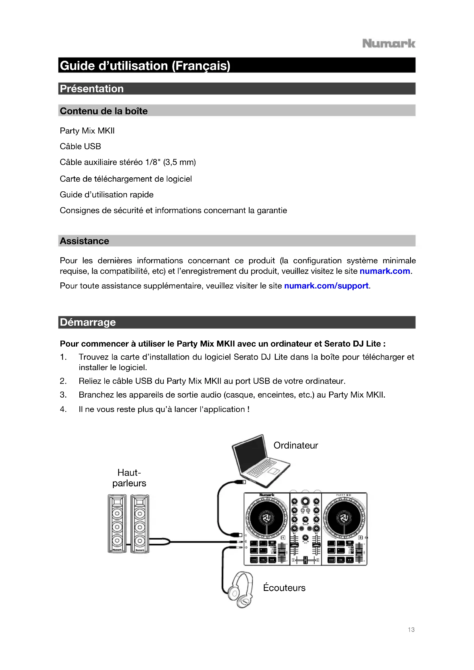 Assistance Pour les dernières informations concernant ce produit (la configuration système minimale requise, la compatibilité, etc) et l’enregistrement du produit, veuillez visitez le site numark.com. Pour toute assistance supplémentaire, veuillez visiter le site numark.com/support.