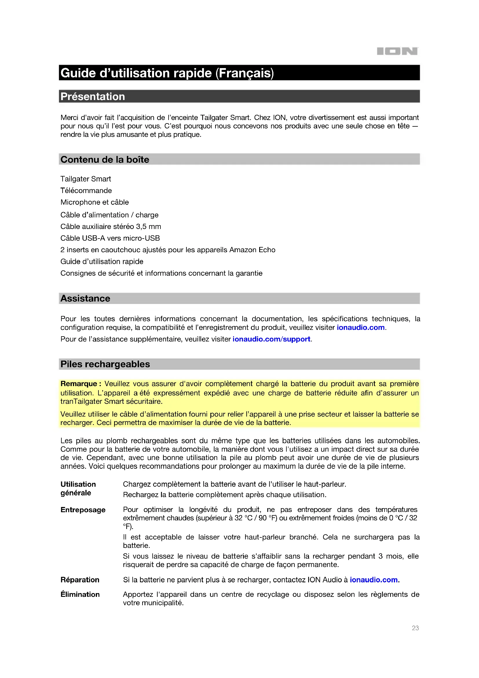 Piles rechargeables Remarque : Veuillez vous assurer d'avoir complètement chargé la batterie du produit avant sa première utilisation. L’appareil a été expressément expédié avec une charge de batterie réduite afin d’assurer un tranTailgater Smart sécuritaire. Veuillez utiliser le câble d’alimentation fourni pour relier l’appareil à une prise secteur et laisser la batterie se recharger. Ceci permettra de maximiser la durée de vie de la batterie. Les piles au plomb rechargeables sont du même type que les batteries utilisées dans les automobiles. Comme pour la batterie de votre automobile, la manière dont vous l'utilisez a un impact direct sur sa durée de vie. Cependant, avec une bonne utilisation la pile au plomb peut avoir une durée de vie de plusieurs années. Voici quelques recommandations pour prolonger au maximum la durée de vie de la pile interne. Utilisation générale Chargez complètement la batterie avant de l'utiliser le haut-parleur. Rechargez la batterie complètement après chaque utilisation. Entreposage Pour optimiser la longévité du produit, ne pas entreposer dans des températures extrêmement chaudes (supérieur à 32 °C / 90 °F) ou extrêmement froides (moins de 0 °C / 32 °F). Il est acceptable de laisser votre haut-parleur branché. Cela ne surchargera pas la batterie. Si vous laissez le niveau de batterie s'affaiblir sans la recharger pendant 3 mois, elle risquerait de perdre sa capacité de charge de façon permanente. Réparation Si la batterie ne parvient plus à se recharger, contactez ION Audio à ionaudio.com. Élimination Apportez l'appareil dans un centre de recyclage ou disposez selon les règlements de votre municipalité.24 Démarrage