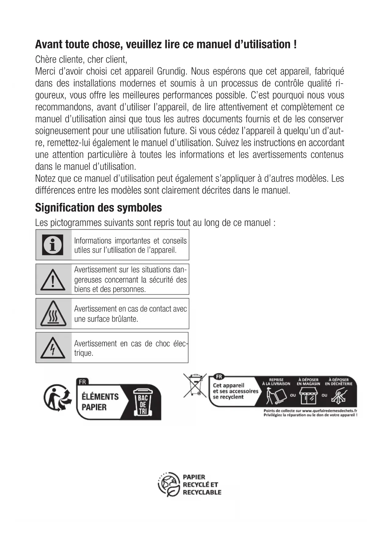 Diese Garantiezusage ist gültig innerhalb der Bundesrepublik Deutschland *) 0,14 EUR/Min. aus dem Festnetz der T-Com; Mobilfunk max. 0,42 EUR/Min. (nur für Deutschland) Garantiebedingungen Garantiebedingungen - Grundig - 06/2013 Beko Grundig Deutschland GmbH Rahmannstraße 3 65760 EschbornAvant toute chose, veuillez lire ce manuel d’utilisation ! Chère cliente, cher client, Merci d’avoir choisi cet appareil Grundig. Nous espérons que cet appareil, fabriqué dans des installations modernes et soumis à un processus de contrôle qualité ri- goureux, vous offre les meilleures performances possible. C’est pourquoi nous vous recommandons, avant d’utiliser l’appareil, de lire attentivement et complètement ce manuel d’utilisation ainsi que tous les autres documents fournis et de les conserver soigneusement pour une utilisation future. Si vous cédez l’appareil à quelqu’un d’aut- re, remettez-lui également le manuel d’utilisation. Suivez les instructions en accordant une attention particulière à toutes les informations et les avertissements contenus dans le manuel d’utilisation. Notez que ce manuel d’utilisation peut également s’appliquer à d’autres modèles. Les différences entre les modèles sont clairement décrites dans le manuel. Signification des symboles Les pictogrammes suivants sont repris tout au long de ce manuel :