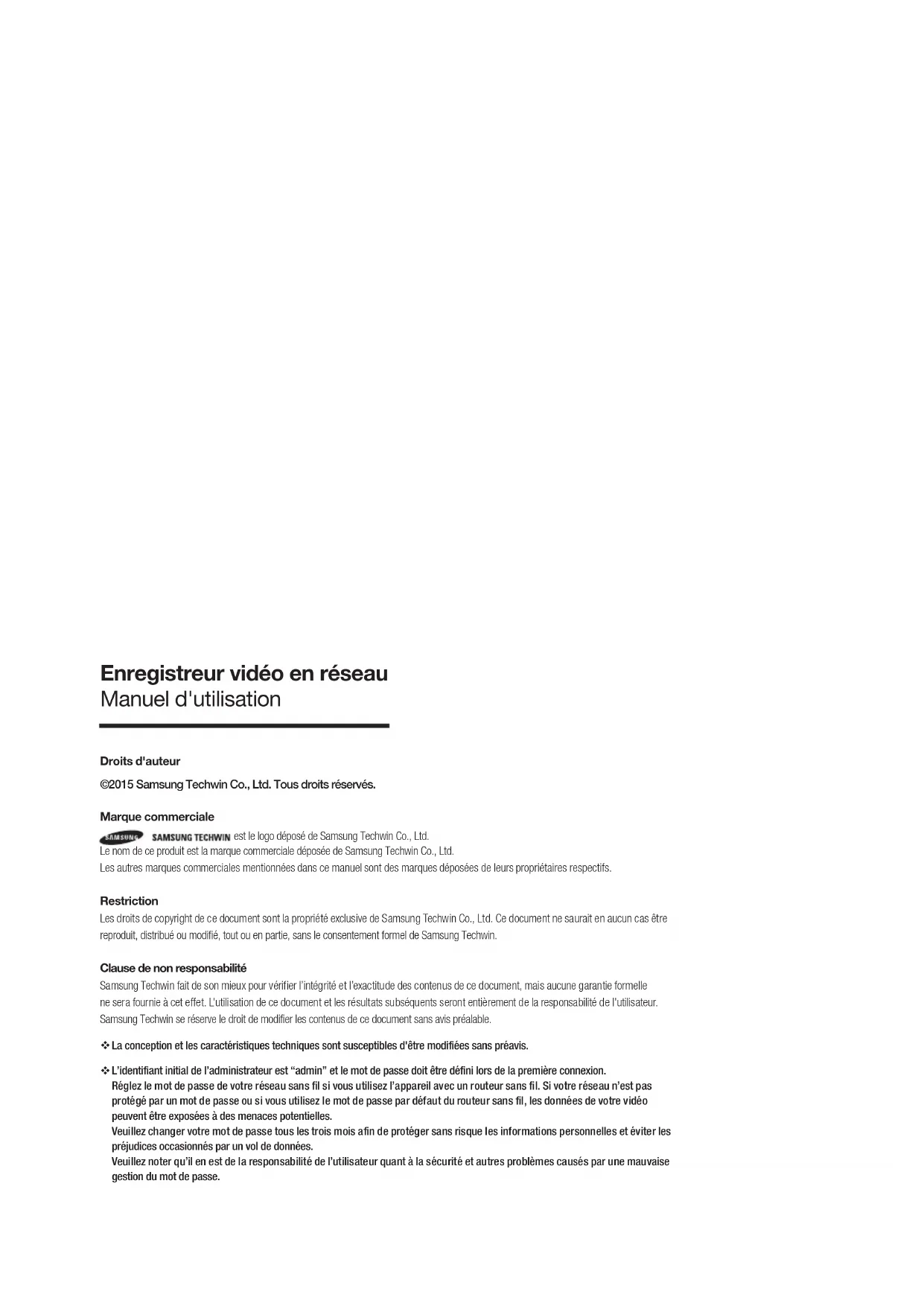 2015 Samsung Techwin Co., Ltd. Tous droits réservés. Marque commerciale est le logo déposé de Samsung Techwin Co., Ltd. Le nom de ce produit est la marque commerciale déposée de Samsung Techwin Co., Ltd. Les autres marques commerciales mentionnées dans ce manuel sont des marques déposées de leurs propriétaires respectifs. Restriction Les droits de copyright de ce document sont la propriété exclusive de Samsung Techwin Co., Ltd. Ce document ne saurait en aucun cas être reproduit, distribué ou modifié, tout ou en partie, sans le consentement formel de Samsung Techwin. Clause de non responsabilité Samsung Techwin fait de son mieux pour vérifier l’intégrité et l’exactitude des contenus de ce document, mais aucune garantie formelle ne sera fournie à cet effet. L'utilisation de ce document et les résultats subséquents seront entièrement de la responsabilité de l'utilisateur. Samsung Techwin se réserve le droit de modifier les contenus de ce document sans avis préalable.