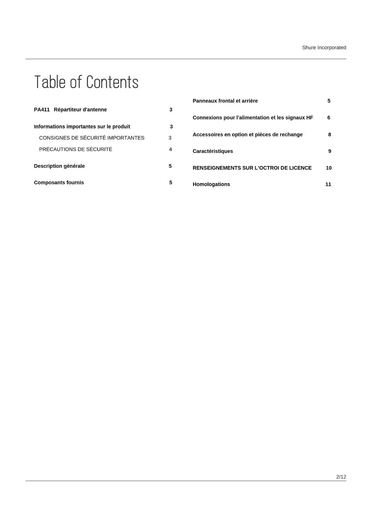 PA411 Répartiteur d'antenne Th Shure antenna combiner, PA411, user guide. Version: 1.1 (2020-I)Shure Incorporated 2/12 Table of Contents PA411 Répartiteur d'antenne 3 Informations importantes sur le produit 3