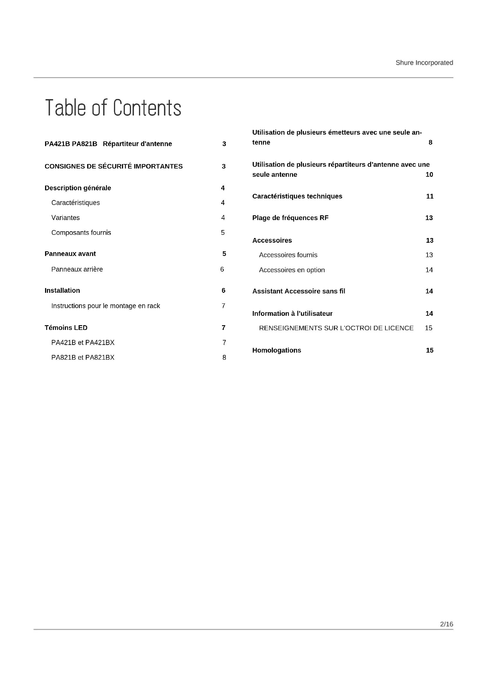 Description générale 4 Caractéristiques 4 Variantes 4 Composants fournis 5 Panneaux avant 5 Panneaux arrière 6 Installation 6 Instructions pour le montage en rack 7 Témoins LED 7 PA421B et PA421BX 7 PA821B et PA821BX 8 Utilisation de plusieurs émetteurs avec une seule an tenne 8 Utilisation de plusieurs répartiteurs d’antenne avec une seule antenne 10 Caractéristiques techniques 11 Plage de fréquences RF 13 Accessoires 13 Accessoires fournis 13 Accessoires en option 14 Assistant Accessoire sans fil 14 Information à l’utilisateur 14