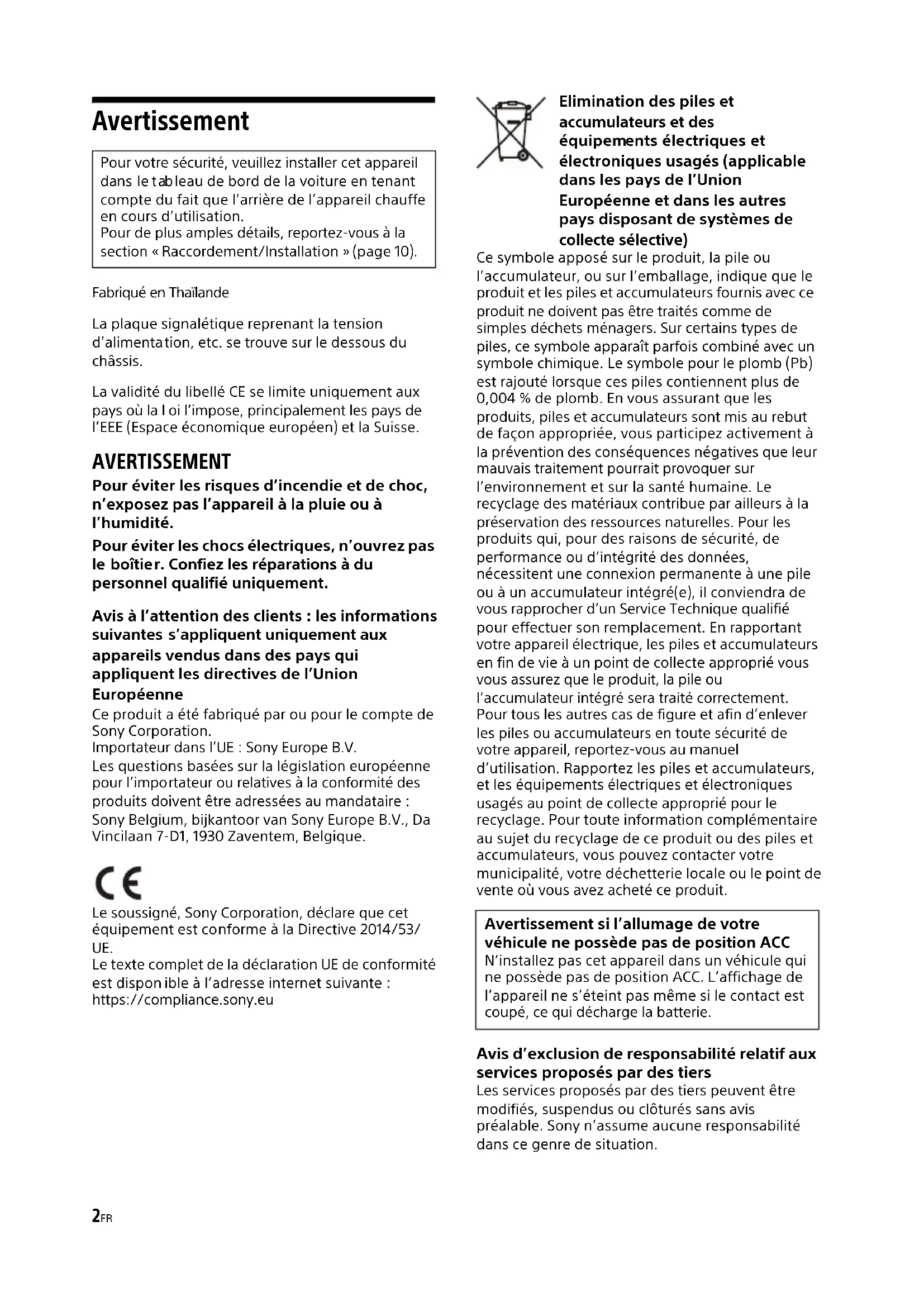 boîtie r. Confiez les réparations à du personnel qualifié uniquement. Avis à l’attention des clients : les informations suivantes s’appliquent uniquement aux appareils vendus dans des pays qui appliquent les directives de l’Union Européenne Ce produit a été fabriqué par ou pour le compte de Sony Corporation.Importateur dans l’UE : Sony Europe B.V.Les questions basées sur la législation européenne pour l’importateur ou relatives à la conformité des produits doivent être adressées au mandataire : Sony Belgium, bijkantoor van Sony Europe B.V., Da Vincilaan 7-D1, 1930 Zaventem, Belgique.Le soussigné, Sony Corporation, déclare que cet quipement est conforme à la Directive 2014/53/ UE. Le texte complet de la déclaration UE de conformité est disponible à l’adresse internet suivante :https://compliance.sony.eu Elimination des piles et accumulateurs et des équipem ents électriques et électroniques usagés (applicable dans les pays de l’Union Européenne et dans les autres pays disposant de systèmes de collecte sélective) Ce symbole apposé sur le produit, la pile ou l’accumulateur, ou sur l’emballage, indique que le produit et les piles et accumulateurs fournis avec ce produit ne doivent pas être traités comme de simples déchets ménagers. Sur certains types de piles, ce symbole apparaît parfois combiné avec un symbole chimique. Le symbole pour le plomb (Pb) est rajouté lorsque ces piles contiennent plus de 0,004 % de plomb. En vous assurant que les produits, piles et accumulateurs sont mis au rebut de façon appropriée, vous participez activement à la prévention des conséquences négatives que leur mauvais traitement pourrait provoquer sur l’environnement et sur la santé humaine. Le recyclage des matériaux contribue par ailleurs à la préservation des ressources naturelles. Pour les produits qui, pour des raisons de sécurité, de performance ou d’intégrité des données, nécessitent une connexion permanente à une pile ou à un accumulateur intégré(e), il conviendra de vous rapprocher d’un Service Technique qualifié pour effectuer son remplacement. En rapportant votre appareil électrique, les piles et accumulateurs en fin de vie à un point de collecte approprié vous vous assurez que le produit, la pile ou l’accumulateur intégré sera traité correctement. Pour tous les autres cas de figure et afin d’enlever les piles ou accumulateurs en toute sécurité de votre appareil, reportez-vous au manuel d’utilisation. Rapportez les piles et accumulateurs, et les équipements électriques et électroniques usagés au point de collecte approprié pour le recyclage. Pour toute information complémentaire au sujet du recyclage de ce produit ou des piles et accumulateurs, vous pouvez contacter votre municipalité, votre déchetterie locale ou le point de vente où vous avez acheté ce produit. Avis d’exclusion de responsabilité relatif aux services proposés par des tiers Les services proposés par des tiers peuvent être modifiés, suspendus ou clôturés sans avis préalable. Sony n’assume aucune responsabilité dans ce genre de situation.Pour votre sécurité, veuillez installer cet appareil