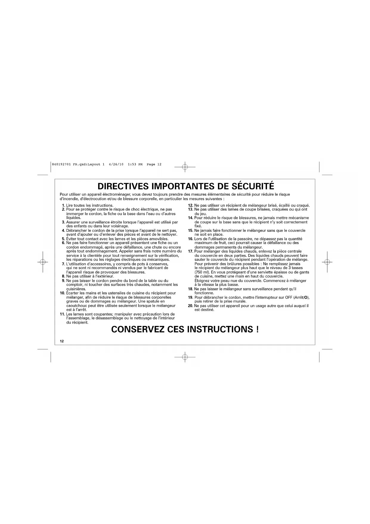 12. Ne pas utiliser un récipient de mélangeur brisé, écaillé ou craqué.