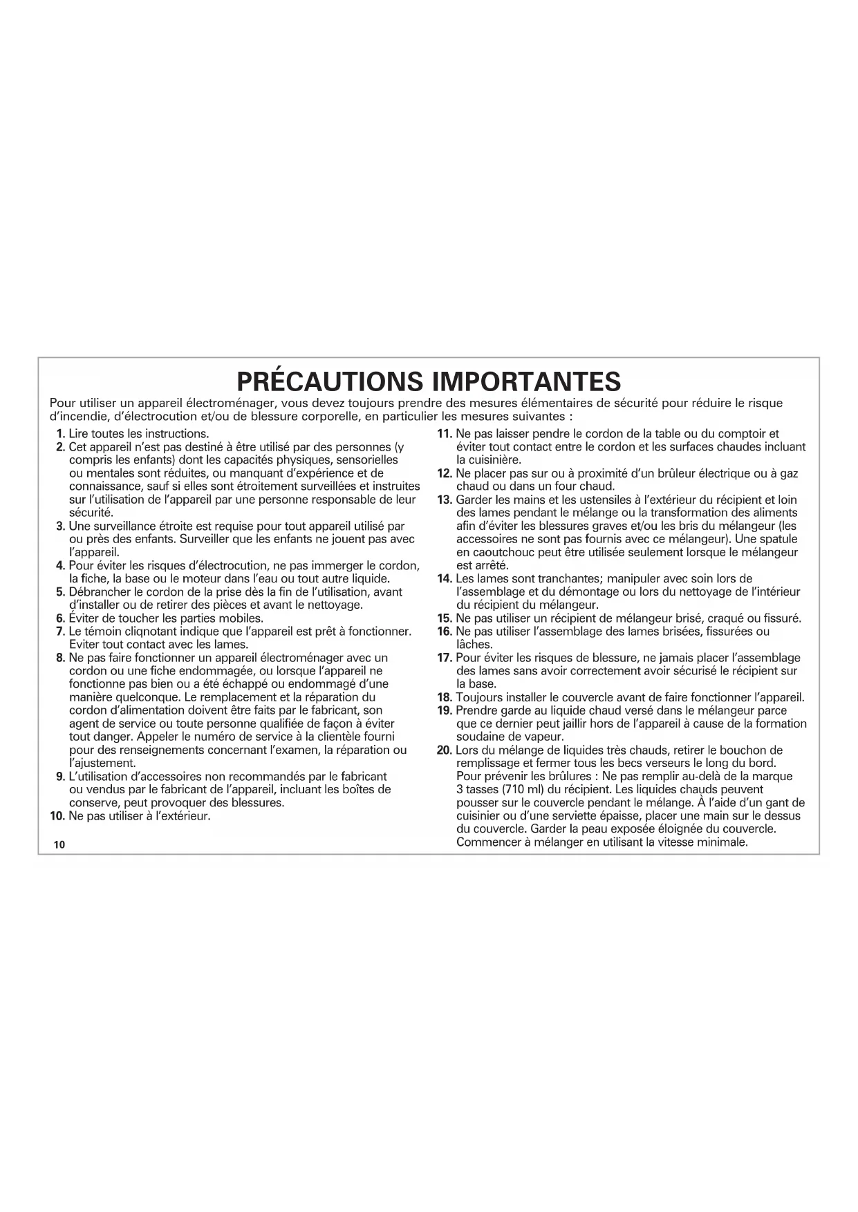 remplissage et fermer tous les becs verseurs le long du bord. Pour prévenir les brûlures : Ne pas remplir au-delà de la marque 3 tasses (710 ml) du récipient. Les liquides chauds peuvent pousser sur le couvercle pendant le mélange. À l’aide d’un gant de cuisinier ou d’une serviette épaisse, placer une main sur le dessus du couvercle. Garder la peau exposée éloignée du couvercle. Commencer à mélanger en utilisant la vitesse minimale. Pour utiliser un appareil électroménager, vous devez toujours prendre des mesures élémentaires de sécurité pour réduire le risque d’incendie, d’électrocution et/ou de blessure corporelle, en particulier les mesures suivantes :11 Autres consignes de sécurité pour le consommateur Cet appareil est destiné à un usage domestique uniquement. Utiliser seulement pour les aliments et les liquides. w AVERTISSEMENT Risque de choc électrique : Cet appareil est fourni avec une fiche polarisée (une broche large) pour réduire le risque d’électrocution. Cette fiche n’entre que dans un seul sens dans une prise polarisée. Ne contrecarrez pas l’objectif sécuritaire de cette fiche en la modifiant de quelque manière que ce soit ou en utilisant un adaptateur. Si vous ne pouvez pas insérer complètement la fiche dans la prise, inversez la fiche. Si elle refuse toujours de s’insérer, faire remplacer la prise par un électricien. La longueur du cordon installé sur cet appareil a été sélectionnée afin de réduire les risques d’enchevêtrement ou de faux pas causés par un fil trop long. L’utilisation d’une rallonge approuvée est permise si le cordon est trop court. Les caractéristiques électriques de la rallonge doivent être équivalentes ou supérieures aux caractéristiques de l’appareil. Prendre toutes les précautions nécessaires pour installer la rallonge de manière à ne pas la faire courir sur le comptoir ou sur une table pour éviter qu’un enfant ne tire sur le cordon ou trébuche accidentellement. Les lames qui se bloquent ou refusent de bouger peuvent endommager le moteur. Ne pas utiliser. Appeler le centre de service à la clientèle pour obtenir des renseignements. Ne pas stocker le récipient du mélangeur au congélateur s’il contient des aliments ou du liquide. Ceci pourrait endommager les lames, le récipient, le mélangeur et éventuellement, occasionner des blessures. La puissance et l’intensité nominales du mélangeur sont déterminées par un essai du Underwriters laboratories basé sur des combinaisons de lames, de récipient et des accessoires pouvant ne pas être offerts pour votre appareil, mais offertes comme pièces de rechange. Ceci est une mesure d’entrée de tension et d’intensité suite à un fonctionnement d’une durée de 30 secondes. Le mélangeur, comme fourni, peut être plus éconergétique. La puissance maximale est la mesure de la puissance restituée du moteur au cours des premières secondes de fonctionnement. Ceci représente la puissance maximale requise par votre mélangeur pour piler la glace, les fruits congelés, etc. Ceci est une mesure plus juste du moteur du mélangeur lors de sa demande énergétique maximale. Information au sujet de la tension et de la puissance maximale