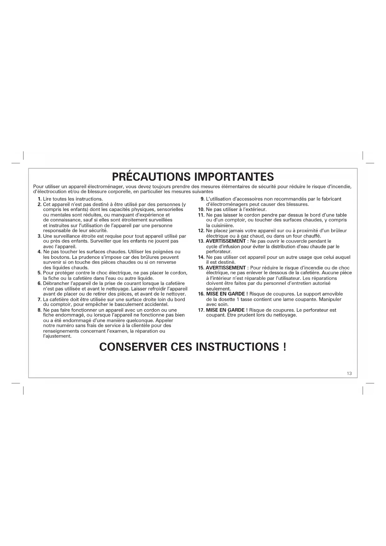 Autres renseignements relatifs à la sécurité du consommateur Cet appareil est destiné à un usage domestique uniquement. w AVERTISSEMENT Risque de choc électrique : Cet appareil est fourni avec une fiche polarisée (une broche large) pour réduire le risque d’électrocution. Cette fiche n’entre que dans un seul sens dans une prise polarisée. Ne contrecarrez pas l’objectif sécuritaire de cette fiche en la modifiant de quelque manière que ce soit ou en utilisant un adaptateur. Si vous ne pouvez pas insérer complètement la fiche dans la prise, inversez la fiche. Si elle refuse toujours de s’insérer, faire remplacer la prise par un électricien. La longueur du cordon installé sur cet appareil a été sélectionnée afin de réduire les risques d’enchevêtrement ou de faux pas causés par un fil trop long. L’utilisation d’une rallonge approuvée est permise si le cordon est trop court. Les caractéristiques électriques de la rallonge doivent être équivalentes ou supérieures aux caractéristiques de l’appareil. Prendre toutes les précautions nécessaires pour installer la rallonge de manière à ne pas la faire courir sur le comptoir ou sur une table pour éviter qu’un enfant ne tire sur le cordon ou trébuche accidentellement. Afin d’éviter une surcharge électrique, évitez d’utiliser un autre appareil à haute puissance sur le même circuit que la cafetière.15 Languette du couvercle (2) Pièces et caractéristiques Entonnoir (2)* Support amovible de dosette 1 tasse (2)* Panier-filtre amovible pour café finement moulu (2)* Plateau perforé ajustable (2)* Base Couvercle (2) Languette du couvercle (2) Niveaux de remplissage d’eau de réservoir d’eau Niveau 14 oz (414 ml) Niveau 10 oz (296 ml) Niveau 8 oz (237 ml) Filtre à eau amovible (Doit rester en place pendant l’infusion. Ne retirer que pour laver.) Poignée du panier-filtre Poignée de l’entonnoir AVANT LA PREMIÈRE UTILISATION : Laver toutes les pièces amovibles dans de l’eau chaude savonneuse. Rincer et sécher. Faire un cycle d’infusion en ayant ajouter de l’eau de chaque côté puis jeter l’eau à la fin du cycle. Repose-tasse ajustable (2)* Joint d’étanchéité de café moulu (2) Réservoir d’eau (2) Plateau perforé supérieur/Position du repose-tasse Plateau perforé inférieur/Position du repose-tasse Bouton MARCHE/ ARRÊT (I/O) (2) Soupape de remplissage (2) (NE PAS ENLEVER) Ligne de remplissage MAX. *Pour commander des pièces : Canada : 1.800.267.2826 Perforateur (2)16 Comment infuser la dosette 1 tasse w AVERTISSEMENT Risque de brûlure. Pour éviter tout contact avec le café ou l’eau brûlant :