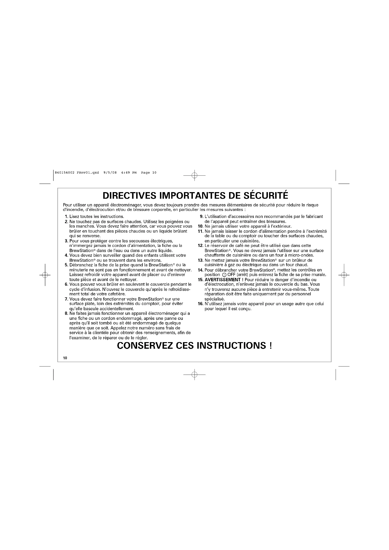 pour lequel il est conçu. Pour utiliser un appareil électroménager, vous devez toujours prendre des mesures élémentaires de sécurité pour réduire le risque d’incendie, d’électrocution et/ou de blessure corporelle, en particulier les mesures suivantes : CONSERVEZ CES INSTRUCTIONS ! 840156002 FRnv01.qxd 9/5/08 4:49 PM Page 1011 IMPORTANT N’utilisez jamais le réservoir de café pour verser du café chaud ou pour transporter du café chaud. Ne manipulez le réservoir de café que lorsqu’il contient de l’eau froide. AUTRES RENSEIGNEMENTS RELATIFS À LA SÉCURITÉ DU CONSOMMATEUR Cet appareil ne doit servir qu’à un usage domestique. ATTENTION ! Danger d'électrocution : Cet appareil électoménager possède une fiche polarisée (une broche large) qui réduit le danger d'électrocution. Cette fiche n'entre que dans un seul sens dans une prise polarisée. Ne contrecarrez pas l'objectif sécuritaire de cette fiche en la modifiant de quelque manière que ce soit ou en utilisant un adaptateur. Si la fiche n'entre pas bien, retournez-la. Si elle continue à ne pas bien entrer, demandez à un électricien de remplacer la prise. La longueur du cordon de cet appareil a été choisie de façon à ce que l’on ne risque pas de trébucher dessus. Si un cordon plus long est nécessaire, utiliser une rallonge appropriée. Le calibre de la rallonge doit être le même que celui de l’appareil ou supérieur. Vous devez veiller à disposer la rallonge de manière à ce qu’elle ne pende pas du comptoir ou de la table, où elle pourrait être tirée par des enfants ou faire trébucher. Pour éviter une surcharge des circuits électriques, n’utilisez pas un autre appareil électroménager sur le même circuit que votre BrewStation