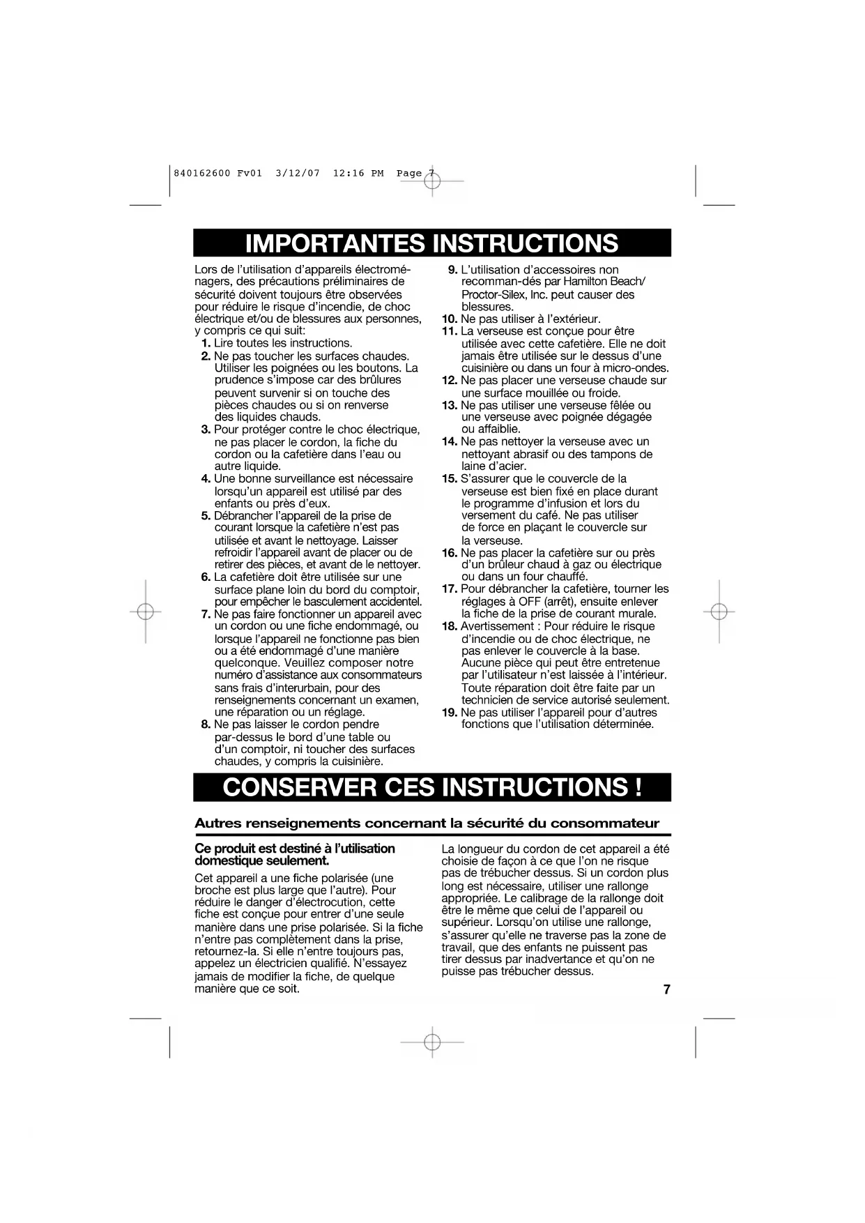 In the U.S. 1-800-851-8900 In Canada 1-800-267-2826 hamiltonbeach.com KEEP THESE NUMBERS FOR FUTURE REFERENCE! 840162600 Ev02 3/12/07 12:15 PM Page 67 IMPORTANTES INSTRUCTIONS CONSERVER CES INSTRUCTIONS ! Lors de l’utilisation d’appareils électromé- nagers, des précautions préliminaires de sécurité doivent toujours être observées pour réduire le risque d’incendie, de choc électrique et/ou de blessures aux personnes, y compris ce qui suit: