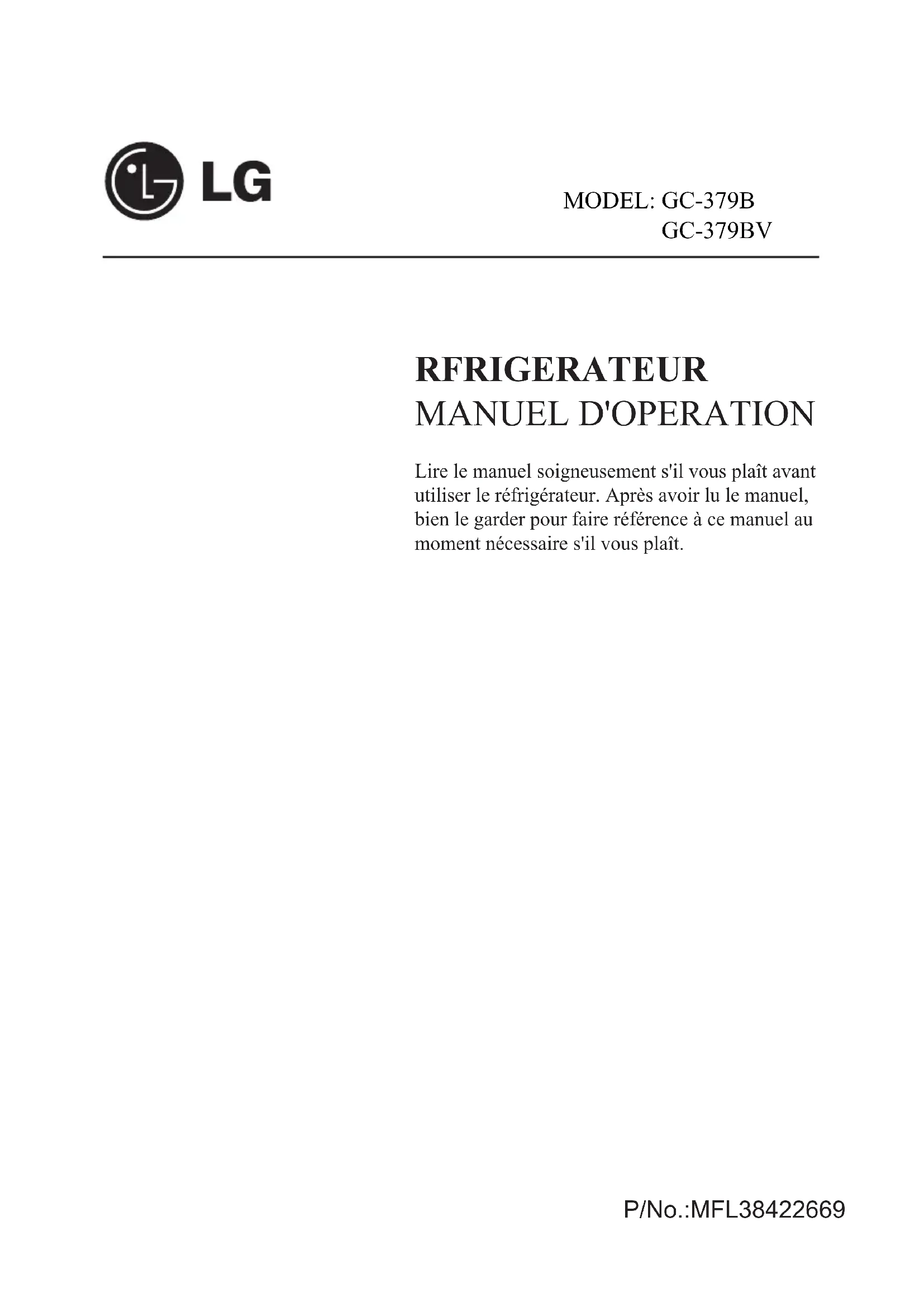 GC-379BV RFRIGERATEUR MANUEL D'OPERATION Lire le manuel soigneusement s'il vous plaît avant utiliser le réfrigérateur. Après avoir lu le manuel, bien le garder pour faire référence à ce manuel au moment nécessaire s'il vous plaît. P/No.:MFL38422669Contenu