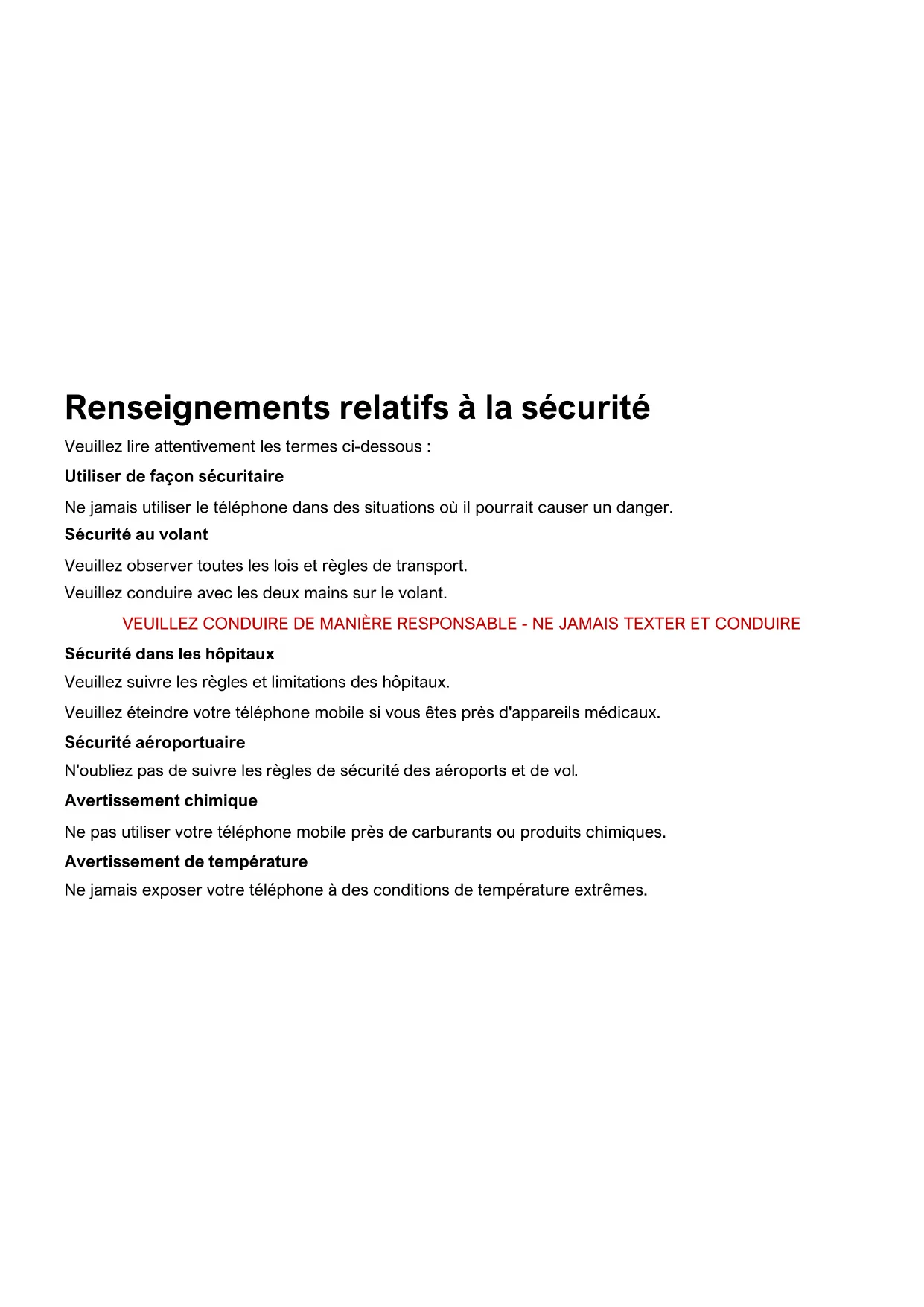 FCC ID: YHLBLUC5L20Renseignements relatifs à la sécurité Veuillez lire attentivement les termes ci-dessous : Utiliser de façon sécuritaire Ne jamais utiliser le téléphone dans des situations où il pourrait causer un danger. Sécurité au volant Veuillez observer toutes les lois et règles de transport. Veuillez conduire avec les deux mains sur le volant. VEUILLEZ CONDUIRE DE MANIÈRE RESPONSABLE - NE JAMAIS TEXTER ET CONDUIRE Sécurité dans les hôpitaux Veuillez suivre les règles et limitations des hôpitaux. Veuillez éteindre votre téléphone mobile si vous êtes près d'appareils médicaux. Sécurité aéroportuaire N'oubliez pas de suivre les règles de sécurité des aéroports et de vol. Avertissement chimique Ne pas utiliser votre téléphone mobile près de carburants ou produits chimiques. Avertissement de température Ne jamais exposer votre téléphone à des conditions de température extrêmes.Risque lié à l'eau Votre téléphone n'est pas à l'épreuve de l'eau. Garder votre téléphone à l'abri de l'eau ou de tout autre liquide pour éviter des dommages. Appels d'urgence S'assurer que votre téléphone mobile est allumé dans une zone de service. Dans l'écran d'accueil, toucher sur la touche téléphone et composer le numéro d'urgence. Accessoires et batteries Utiliser seulement des batteries et accessoires homologués pour BLU. Sauvegarde des informations Ne pas oublier de conserver par écrit toutes les informations importantes. Sécurité de la batterie et mesures de précautions > Pour de meilleurs résultats et une meilleure autonomie de la batterie, il est recommandé de charger la batterie complétement avant d'utiliser le téléphone mobile pour la première fois. > La performance optimale d'une nouvelle batterie est généralement obtenue après deux ou trois cycles de charge complets. Note : Ne pas oublier que la surcharge continue aura des répercussions sur la durée de vie de la batterie. > Pendant la charge de la batterie, conserver le téléphone mobile hors de portée des enfants. > Garder la batterie dans un endroit frais et sec loin des rayons du soleil et de l'eau.> Ne pas exposer les piles à des températures extrêmes (inférieure à -8 °C (18 °F) ou supérieure à 43 °C (110 °F). > Cesser immédiatement d'utiliser la batterie si elle dégage une odeur, a des fissures et des fuites, une surchauffe, ou si elle est déformée ou à tout autre type de dommage physique. > Éviter d'utiliser le chargeur à proximité ou proche des liquides. Si le chargeur est en contact avec de l'eau ou n'importe quel liquide, le débrancher immédiatement afin de réduire le risque de surchauffe, de mauvais fonctionnement, de décharge électrique ou d'incendie. Déchets dangereux - Mise au rebut des batteries