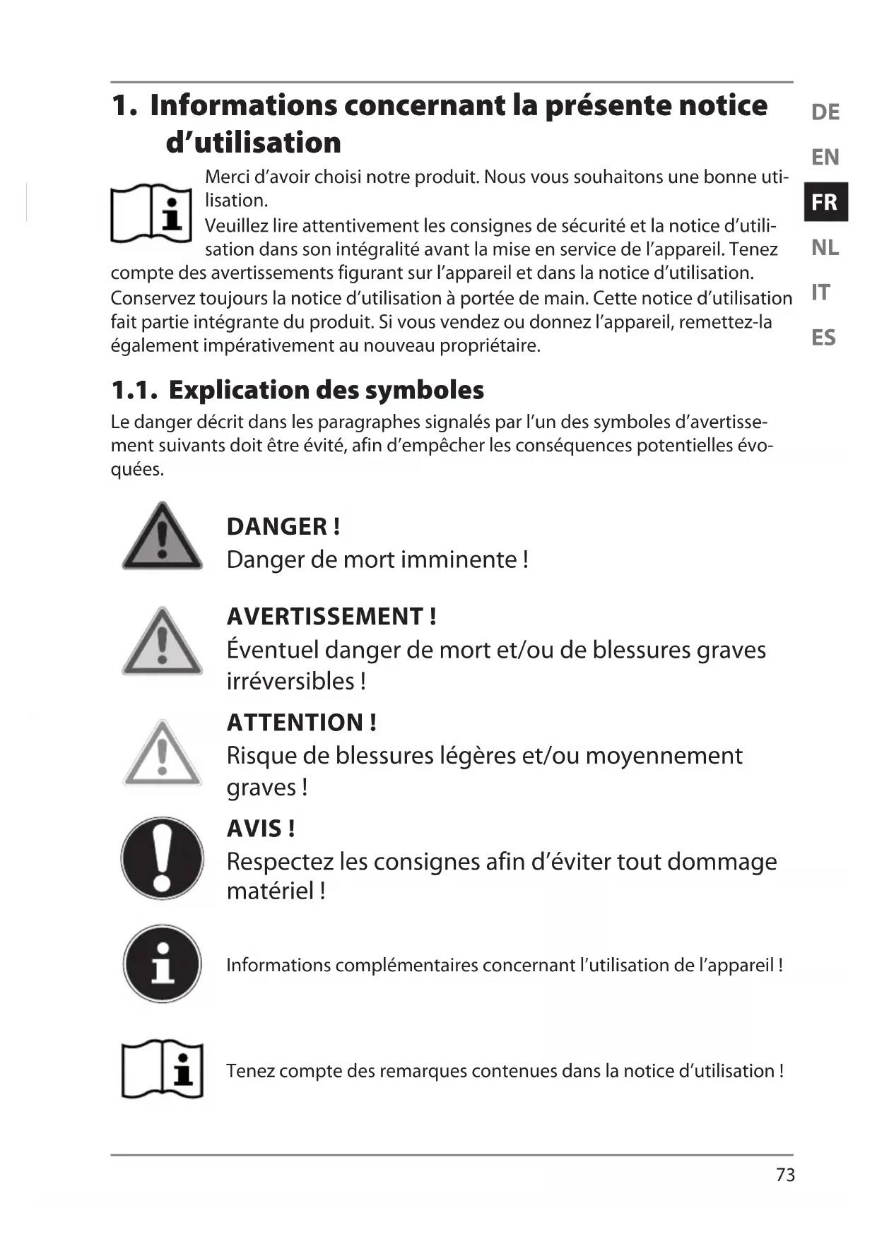 1. Informations concernant la présente notice d’utilisation ...................... 73