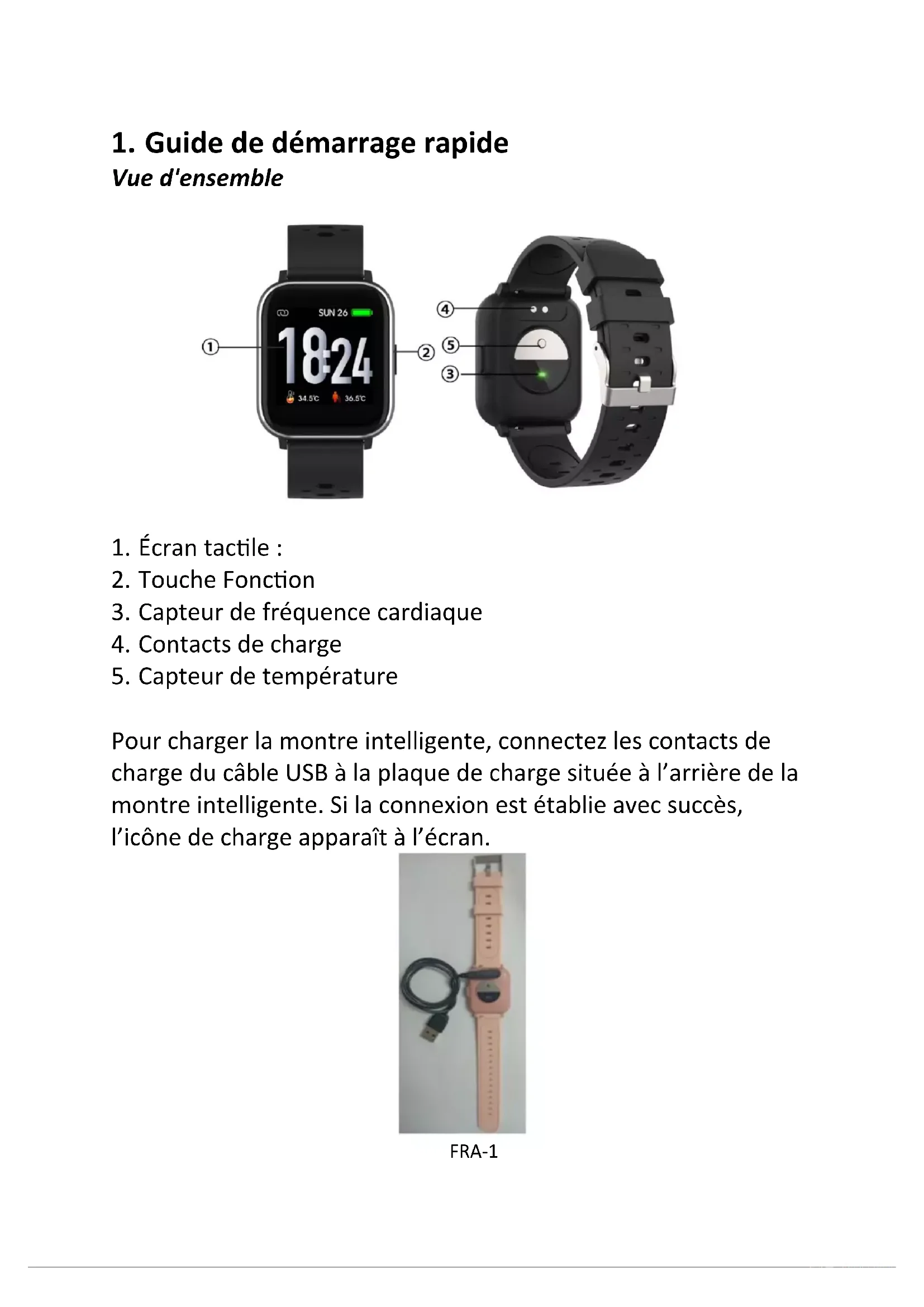 Pour charger la montre intelligente, connectez les contacts de charge du câble USB à la plaque de charge située à l’arrière de la montre intelligente. Si la connexion est établie avec succès, l’icône de charge apparaît à l’écran.FRA-2