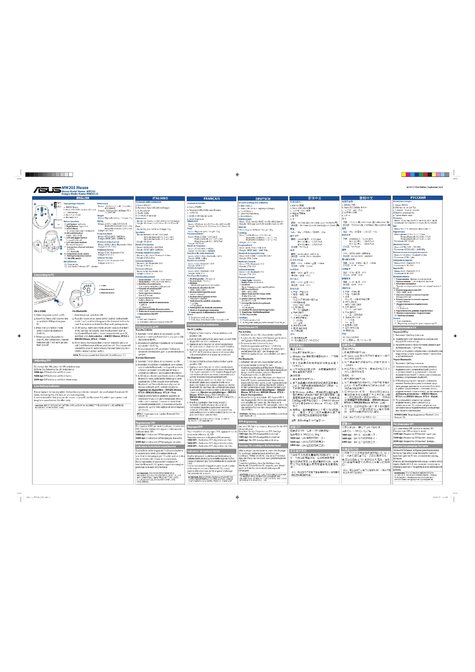 ou la LED 3 de l'indicateur du canal de connexion clignotera à plusieurs reprises avant de s'éteindre. La souris se connectera automatiquement à votre ordinateur lors de sa prochaine mise sous tension. REMARQUE : La souris prend en charge les normes Bluetooth 3.0 et Bluetooth 5.0. Réglages DPI Pour modifier les réglages DPI, appuyez sur le bouton de sélection du DPI. Reportez-vous aux indications DPI suivantes : 1000 DPI: L'indicateur DPI clignotera une fois. 1600 DPI: L'indicateur DPI clignotera deux fois. 2400 DPI: L'indicateur DPI clignotera trois fois. Indicateur de batterie faible Veuillez remplacer la pile lorsque l'indicateur de batterie faible situé sous la molette clignote 10 fois (rouge), indiquant que l'alimentation de la souris est faible. Il est recommandé d'appairer votre souris à votre ordinateur en utilisant Bluetooth 5.0, ce qui permet d'économiser de l'énergie et d'allonger l'autonomie de la souris. ATTENTION: RISQUE D'EXPLOSION SI LA PILE N'EST PAS CORRECTEMENT REMPLACÉE. JETEZ LES PILES USAGÉES CONFORMÉMENT AUX INSTRUCTIONS DU FABRICANT. DEUTSCH Im Lieferumfang sind enthalten: a. MW203 Maus b. Nano-USB-2,4-GHz-Empfänger (Dongle) c. 1 x AA Batterie d. Schnellstartanleitung e. Garantiekarte Abmessungen Maus: 105,65 mm (L) x 80,17 mm (B) x 40,61 mm (H) Dongle: 18,53 mm (L) x 14,50 mm (B) x 6,20 mm (H) Gewicht Maus: 96 g (mit Batterie) / Dongle: 2,0 g Leistung Maus: 2,4-GHz-Modus: 1,5 V / 5,4 mA Bluetooth-3.0-Modus: 1,5 V / 7,7 mA Bluetooth-5.0-Modus: 1,5 V / 5,7 mA Dongle: 5 V / 25 mA Frequenzband Maus: (GFSK) 2403 ~ 2480 MHz Dongle: (GFSK) 2403 ~ 2480 MHz Maximale Ausgangsleistung Maus: GFSK: 0 dbm / Bluetooth: 0 dbm Dongle: GFSK: 2 dbm Hardware-Version Maus: GFSK / Bluetooth: V1.0 Dongle: GFSK: V1.0 Software-Version Maus: GFSK / Bluetooth: V1.0 Dongle: GFSK: V1.0 Tastenfunktionen