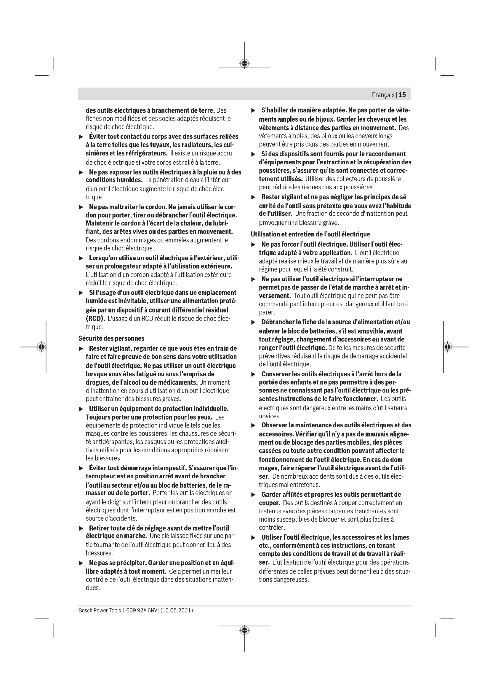 1,5 13,5 1,5 13,5 1,5 Le niveau de vibration et la valeur d’émission sonore indi- qués dans cette notice d’utilisation ont été mesurés confor- mément à la norme et peuvent être utilisés pour une compa- raison entre les outils électroportatifs. Ils peuvent aussi ser- vir de base à une estimation préliminaire du taux de vibration et du niveau sonore. Le niveau de vibration et la valeur d’émission sonore indi- qués s’appliquent pour les utilisations principales de l’outil électroportatif. Si l’outil électroportatif est utilisé pour d’autres applications, avec d’autres accessoires de travail ou sans avoir fait l’objet d’un entretien régulier, le niveau de vi- bration et la valeur d’émission sonore peuvent différer. Il 1 609 92A 6HV | (10.05.2021) Bosch Power ToolsFrançais | 19 peut en résulter des vibrations et un niveau sonore nette- ment plus élevés pendant toute la durée de travail. Pour une estimation précise du niveau de vibration et du ni- veau sonore, il faut aussi prendre en considération les pé- riodes pendant lesquelles l’outil est éteint ou bien en marche sans être vraiment en action. Il peut en résulter au final un ni- veau de vibration et un niveau sonore nettement plus faibles pendant toute la durée de travail. Prévoyez des mesures de protection supplémentaires per- mettant de protéger l’utilisateur de l’effet des vibrations, par exemple: maintenance de l’outil électroportatif et des acces- soires de travail, maintien des mains au chaud, organisation des procédures de travail. Montage u Retirez l’accu de l’appareil électroportatif avant toute intervention (opérations d’entretien/de maintenance, changement d’accessoire, etc.) ainsi que lors de son transport et rangement. Il y a sinon risque de blessure lorsqu’on appuie par mégarde sur l’interrupteur Marche/ Arrêt. Recharge de l’accu u N’utilisez que les chargeurs indiqués dans les Caracté- ristiques techniques. Ils sont les seuls à être adaptés à l’accu Lithium-Ion de votre outil électroportatif. Remarque: L’accu est fourni partiellement chargé. Pour ob- tenir les performances maximales, chargez l’accu jusqu’à sa pleine capacité avant la première utilisation. L’accu Lithium-Ion peut être rechargé à tout moment, sans risquer de réduire sa durée de vie. Le fait d’interrompre le processus de charge n’endommage pas l’accu. L’accu Lithium-Ion est protégé contre une décharge com- plète par «Electronic Cell Protection (ECP)» (l’électronique de protection des cellules). Lorsque l’accu est déchargé, l’outil électroportatif s’arrête grâce à un dispositif d’arrêt de protection: l’accessoire de travail ne tourne plus. u Après l’arrêt automatique de l’outil électroportatif, n’appuyez plus sur l’interrupteur Marche/Arrêt. L’accu pourrait être endommagé. Respectez les indications concernant l’élimination. Retrait de l’accu L’accu (5) dispose de deux positions de verrouillage permet- tant d’éviter que l’accu tombe si l’on appuie par mégarde sur la touche de déverrouillage de l’accu (6). Tant que l’accu reste en place dans l’outil électroportatif, un ressort le main- tient en position. Pour retirer l’accu (5), appuyez sur la touche de déver- rouillage (6) et dégagez l’accu de l’outil électroportatif. Ne forcez pas. Indicateur de niveau de charge de l’accu Les LED vertes de l'indicateur d'état de charge indiquent le niveau de charge de la batterie. Pour des raisons de sécuri- té, il n’est possible d’afficher l’état de charge que quand l’ou- til électroportatif est à l’arrêt. Pour afficher le niveau de charge, appuyez sur le bouton de l'indicateur de niveau de charge ou . L’affichage du ni- veau de charge est également possible après retrait de l’ac- cu. Si aucune LED ne s'allume après avoir appuyé sur le bouton de l'indicateur de niveau de charge, la batterie est défec- tueuse et doit être remplacée. Batterie de type GBA 18V... LED Capacité 3 LED allumées en vert 60–100% 2 LED allumées en vert 30–60% 1 LED allumée en vert 5–30% Clignotement en vert d'1 LED 0–5% Batterie de type ProCORE18V... LED Capacité 5 LED allumées en vert 80−100 % 4 LED allumées en vert 60−80 % 3 LED allumées en vert 40−60 % 2 LED allumées en vert 20−40 % 1 LED allumée en vert 5−20 % Clignotement en vert d’1 LED 0−5 % Mise en place du module Bluetooth® Low Energy GCY42 (accessoire) Pour plus d’informations, veuillez lire la notice d’utilisation du module Bluetooth® Low Energy GCY42. Changement d’accessoire (voir figures A–B) u Retirez l’accu de l’appareil électroportatif avant toute intervention (opérations d’entretien/de maintenance, changement d’accessoire, etc.) ainsi que lors de son transport et rangement. Il y a sinon risque de blessure lorsqu’on appuie par mégarde sur l’interrupteur Marche/ Arrêt. u Lors de la mise en place de l’accessoire de travail, veillez à bien le fixer sur le porte-outil. Si l’accessoire de travail n’est pas correctement fixé, il peut se détacher lors des vissages. Placez l’accessoire de travail (10) sur le carré mâle du porte- outil (1). Bosch Power Tools 1 609 92A 6HV | (10.05.2021)20 | Français Mise en marche Fonctionnement Le porte-outil (1) et l’accessoire de travail sont entraînés par un moteur électrique par l’intermédiaire d’un engrenage et d’un mécanisme de frappe. L’opération se déroule en deux phases: vissage puis serrage (mécanisme de frappe en action). Le mécanisme de frappe entre en action dès que la vis est serrée et que le moteur est sollicité. Le mécanisme de frappe transforme ainsi la puissance du moteur en impacts de rota- tion réguliers. Lors du desserrage des vis ou des écrous, l’opération se déroule dans l’ordre inverse. Mise en marche u Posez toujours l’outil électroportatif sur le côté et pas deb