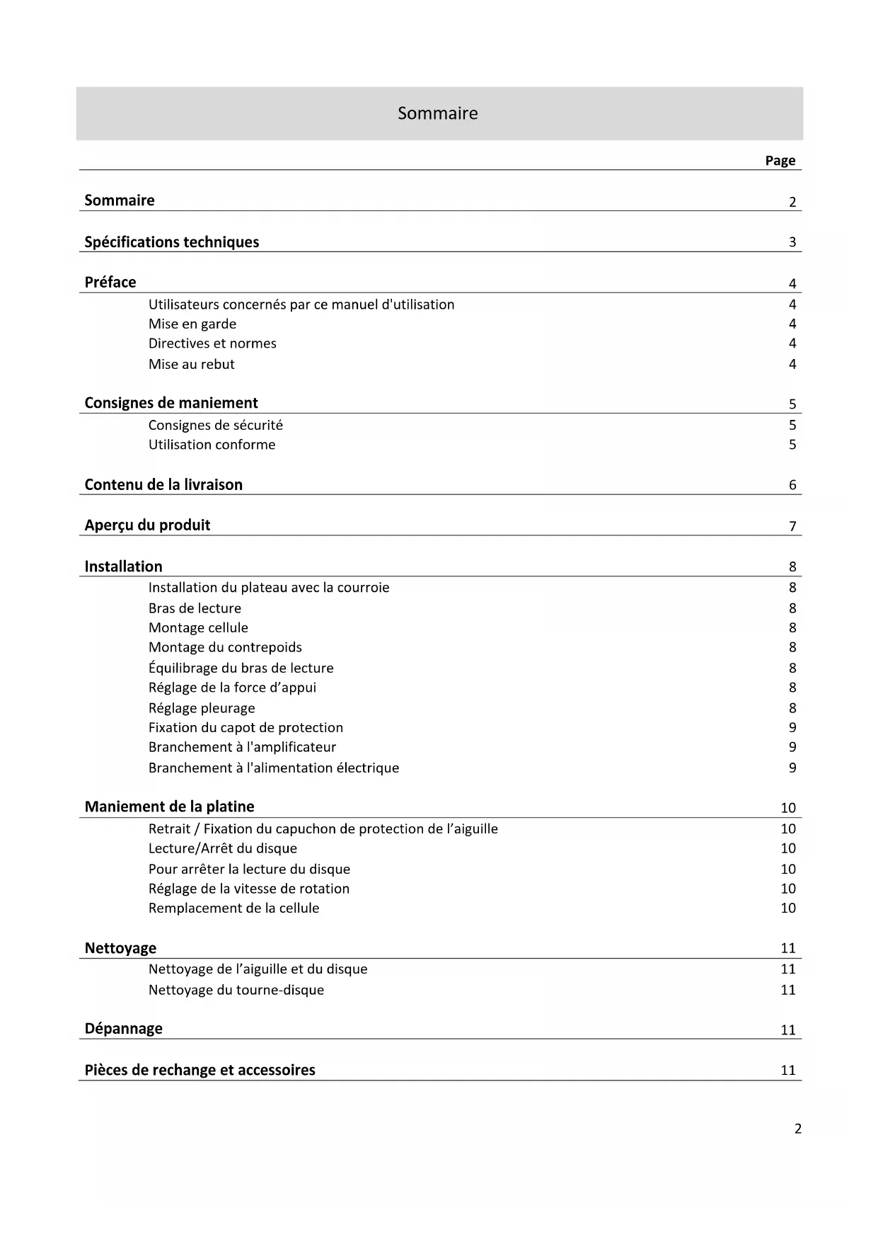 FR: Manuel d'utilisation: Platine vinyle Hi-Fi Pages 2 - 112