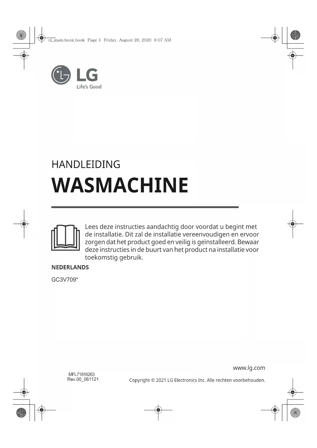 - Als de afstand tussen het toestel en de router te groot is kan het signaal zwak zijn en wordt de verbinding mogelijk onjuist geconfigureerd. Verplaats de router zodat deze zich dichter bij het toestel bevindt. nl_main.book.book Page 56 Friday, August 28, 2020 8:07 AMMemo nl_main.book.book Page 59 Friday, August 28, 2020 8:07 AMMemo nl_main.book.book Page 59 Friday, August 28, 2020 8:07 AMMemo nl_main.book.book Page 59 Friday, August 28, 2020 8:07 AMMemo nl_main.book.book Page 59 Friday, August 28, 2020 8:07 AMMANUEL DU PROPRIÉTAIRE LAVE-LINGE Avant de commencer l’installation, lire attentivement ces instructions. Cela simplifiera l’installation et assurera que le produit soit installé correctement et en toute sécurité. Conserver ces instructions à proximité du produit après installation pour référence ultérieure. FRANÇAIS GC3V709* www.lg.com Copyright © 2021 LG Electronics Inc. Tous droits réservés fr_main.book.book Page 1 Friday, August 28, 2020 8:27 AMTABLE DES MATIÈRES Ce manuel peut contenir des images ou un contenu différent du modèle que vous avez acheté. Ce manuel est sujet à révision par le fabricant.
