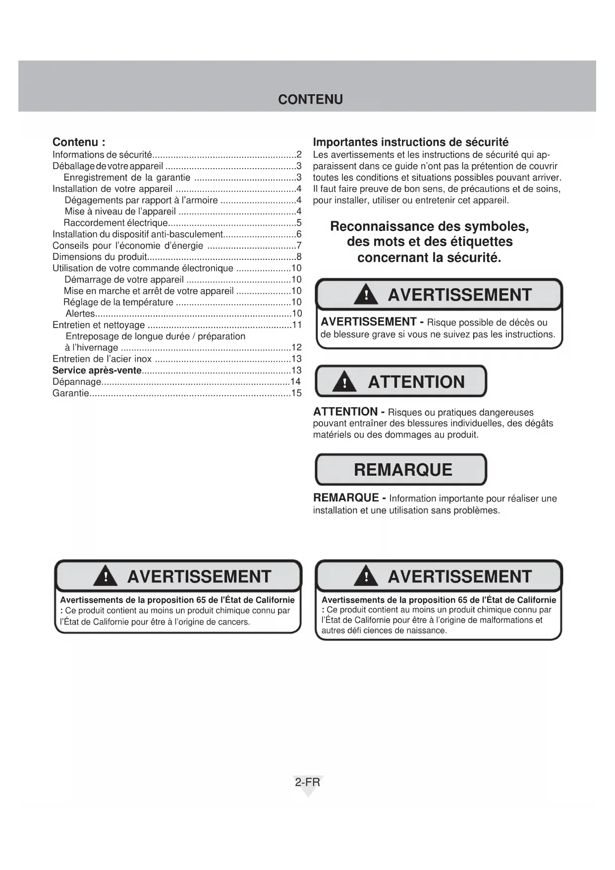 AVERTISSEMENT AVERTISSEMENT - Contribuez à éviter des tragédiesL’emprisonnement d’enfants et leur asphyxie ne sont pas des problèmes du passé. Des épaves de réfrigérateurs abandonnés continuent de présenter un danger - même en restant dehors pour «juste quelques heures».Si vous devez vous débarrasser de votre vieil appareil de refroidissement, veuillez suivre ces instructions pour aider à éviter des accidents possibles.Avant de jeter votre vieux réfrigérateur ou congélateur :• Démontez ses portes ou enlevez ses tiroirs.• Laissez les étagères en place de façon à ce que des enfants ne puissent pas facilement monter dedans.
