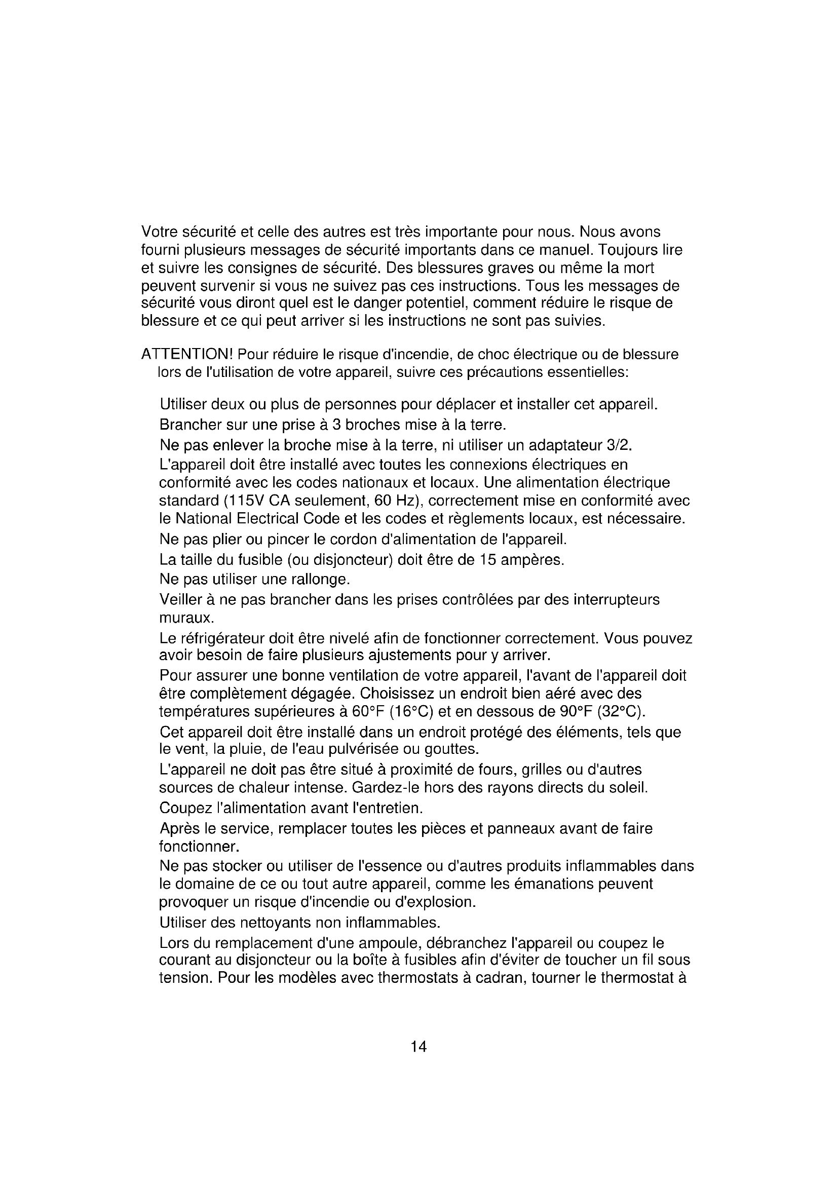 Printed in the USA14 Mesures de sécurité importantes Votre sécurité et celle des autres est très importante pour nous. Nous avons fourni plusieurs messages de sécurité importants dans ce manuel. Toujours lire et suivre les consignes de sécurité. Des blessures graves ou même la mort peuvent survenir si vous ne suivez pas ces instructions. Tous les messages de sécurité vous diront quel est le danger potentiel, comment réduire le risque de blessure et ce qui peut arriver si les instructions ne sont pas suivies. ATTENTION! Pour réduire le risque d'incendie, de choc électrique ou de blessure lors de l'utilisation de votre appareil, suivre ces précautions essentielles: Utiliser deux ou plus de personnes pour déplacer et installer cet appareil. Brancher sur une prise à 3 broches mise à la terre. Ne pas enlever la broche mise à la terre, ni utiliser un adaptateur 3/2. L'appareil doit être installé avec toutes les connexions électriques en conformité avec les codes nationaux et locaux. Une alimentation électrique standard (115V CA seulement, 60 Hz), correctement mise en conformité avec le National Electrical Code et les codes et règlements locaux, est nécessaire. Ne pas plier ou pincer le cordon d'alimentation de l'appareil. La taille du fusible (ou disjoncteur) doit être de 15 ampères. Ne pas utiliser une rallonge. Veiller à ne pas brancher dans les prises contrôlées par des interrupteurs muraux. Le réfrigérateur doit être nivelé afin de fonctionner correctement. Vous pouvez avoir besoin de faire plusieurs ajustements pour y arriver. Pour assurer une bonne ventilation de votre appareil, l'avant de l'appareil doit être complètement dégagée. Choisissez un endroit bien aéré avec des températures supérieures à 60°F (16°C) et en dessous de 90°F (32°C). Cet appareil doit être installé dans un endroit protégé des éléments, tels que le vent, la pluie, de l'eau pulvérisée ou gouttes. L'appareil ne doit pas être situé à proximité de fours, grilles ou d'autres sources de chaleur intense. Gardez-le hors des rayons directs du soleil. Coupez l'alimentation avant l'entretien. Après le service, remplacer toutes les pièces et panneaux avant de faire fonctionner. Ne pas stocker ou utiliser de l'essence ou d'autres produits inflammables dans le domaine de ce ou tout autre appareil, comme les émanations peuvent provoquer un risque d'incendie ou d'explosion. Utiliser des nettoyants non inflammables. Lors du remplacement d'une ampoule, débranchez l'appareil ou coupez le courant au disjoncteur ou la boîte à fusibles afin d'éviter de toucher un fil sous tension. Pour les modèles avec thermostats à cadran, tourner le thermostat à15 STOP (0) (Arrêt) coupe le compresseur, mais ne coupe pas l'alimentation des autres composants électriques. Ne débranchez jamais votre appareil en tirant sur le cordon d'alimentation. Tenez toujours la fiche fermement et tirer tout droit sorti de la prise. Veillez à ne pas écraser ou endommager le cordon pour déplacer l'appareil. Ne vous pincer pas, nouer ou plier le cordon d'alimentation de toute manière. Remplacer ou réparer un cordon de service électrique qui a été endommagé ou effiloché. Débranchez l'appareil avant d'effectuer des réparations ou le nettoyage. Nous recommandons que le service soit effectué par un technicien qualifié. Si votre électricité s'éteint, suivez cette procédure: ✓ Appelez votre compagnie d'électricité pour déterminer combien de temps le service doit être interrompu. ✓ Si le service doit être interrompu pendant moins de 24 heures, garder l'appareil fermé autant que possible. Cela permettra de garder le contenu de se gâter. ✓ Si le service doit être interrompu pendant plus de 24 heures, retirer le contenu et stocker dans un casier réfrigéré ou autre réfrigérateur. DANGER! Risque de piégeage d’enfants! Les anciens appareils peuvent représenter un danger d'étouffement pour les enfants.