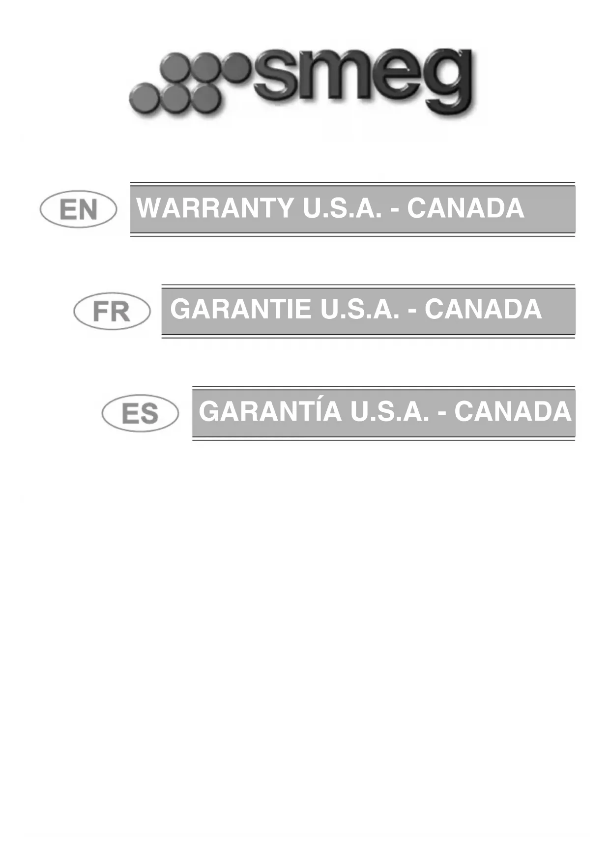 Pour une année, en vigueur à partir de la date originelle d’achat, SMEG USA, Inc. ("SMEG") réparera ou remplacera (selon l’option retenue) toute pièce défectueuse du réfrigérateur due à un défaut de fabrication ou de matériel. Durant cette année complète de garantie, SMEG prendra à sa charge le travail et le service à domicile pour remplacer ou réparer la pièce fautive.