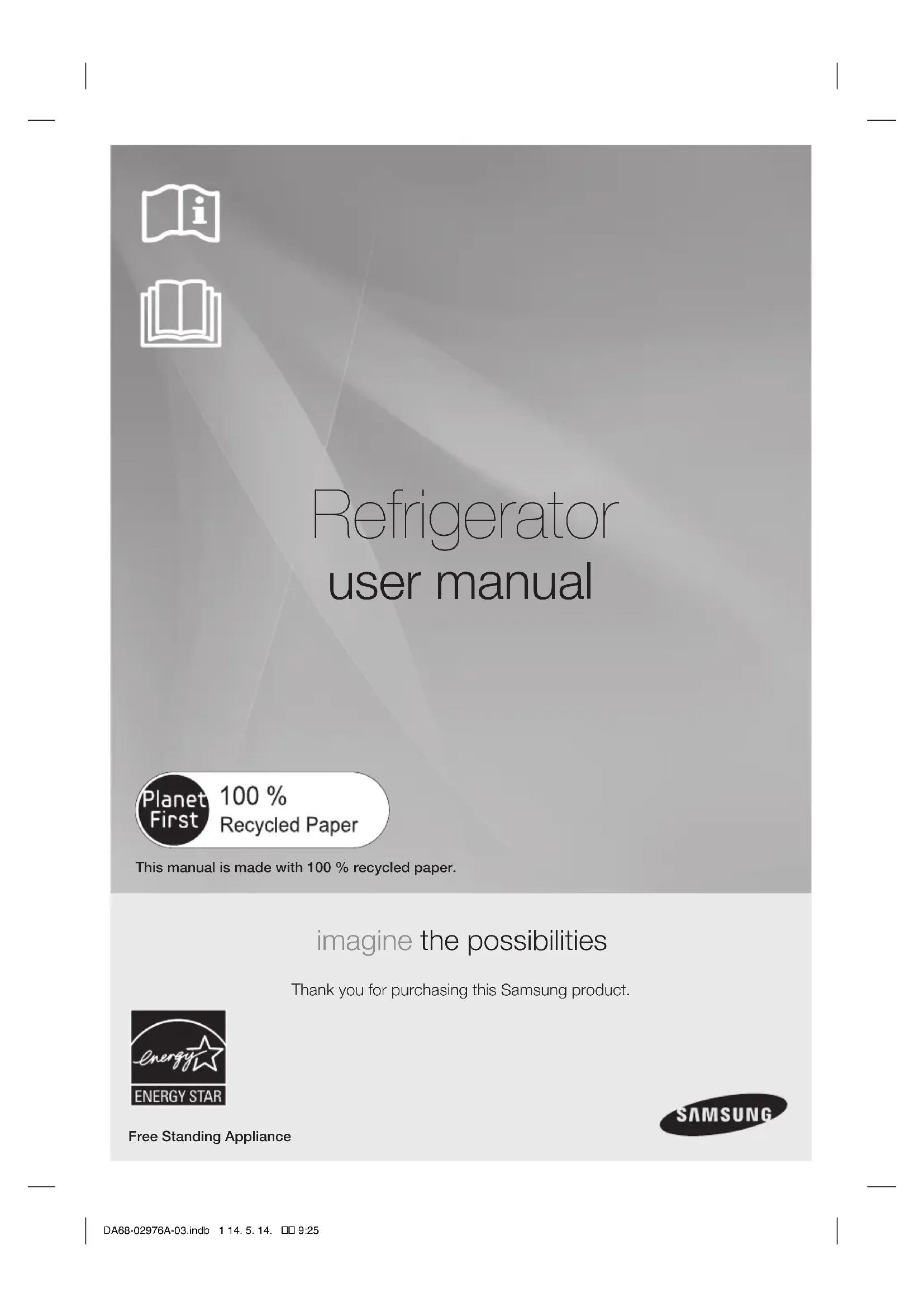 CANADA 1-800-SAMSUNG (726-7864) www.samsung.com/ca/support (English) www.samsung.com/ca_fr/support (French) Samsung Electronics Canada Inc. 2050 Derry Road West, Mississauga, Ontario L5N 0B9 Canada DA68-02976A-03.indb 44 14. 5. 14. 9:26Réfrigérateur manuel d'utilisation un monde de possibilités Merci d’avoir choisi ce produit Samsung. Appareil non encastrable Ce guide est en papier recyclé à 100 %. DA68-02976A-03.indb 1 14. 5. 14. 9:26Français - 2 Consignes de sécurité