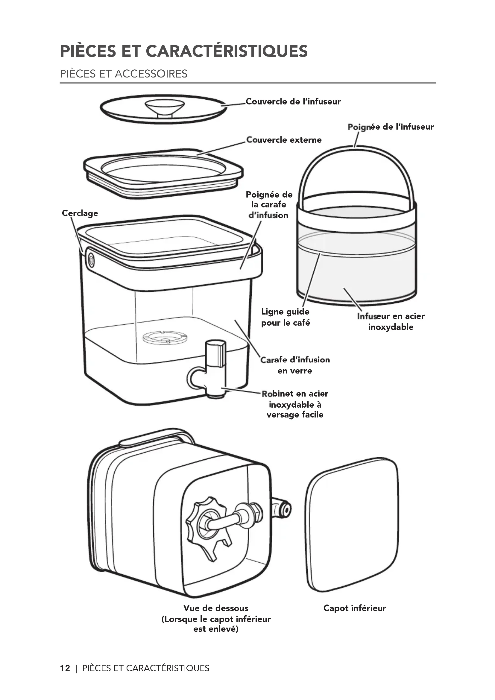 Pour effectuer un nettoyage plus en profondeur (occasionnel): D’abord, pousser sur l’attache pour dégager la porte située à la base de la carafe. W11027076A_FR_v11.indd 19 11/29/16 1:55 PM20 | DÉPANNAGE DÉPANNAGE Si l’infuseur à café froid ne fonctionne pas comme prévu, vérifier les points suivants: — Si le café est trop fort: Moudre votre café de façon plus grossière ou laisser infuser moins de temps. L’infuseur à café froid produit un concentré de café. Pour obtenir la bonne concentration, diluer le concentré de café à l’aide d’eau, de lait ou de boisson sans produit laitier de votre choix. — Si le café est trop faible: Moudre votre café de façon moins grossière ou laisser infuser plus longtemps. L’infusion à froid demande plus de café que les autres méthodes. S’assurer d’utiliser 250g de café. — Si le café a une saveur amère ou désagréable: La saveur peut être affectée si l’infuseur à café n’est pas nettoyé soigneusement. Vous assurer qu’il ne reste pas de savon, de café moulu ou de résidus huileux en rinçant soigneusement toutes les parties après chaque utilisation. Voir la section «Entretien et nettoyage» pour plus d’informations. Si le problème n’est pas attribuable à l’une des raisons indiquées ci-dessus, voir «Obtenir un dépannage» dans la section «Garantie et dépannage». Ne pas retourner l’infuseur au vendeur, il n’assure aucun service après-vente.