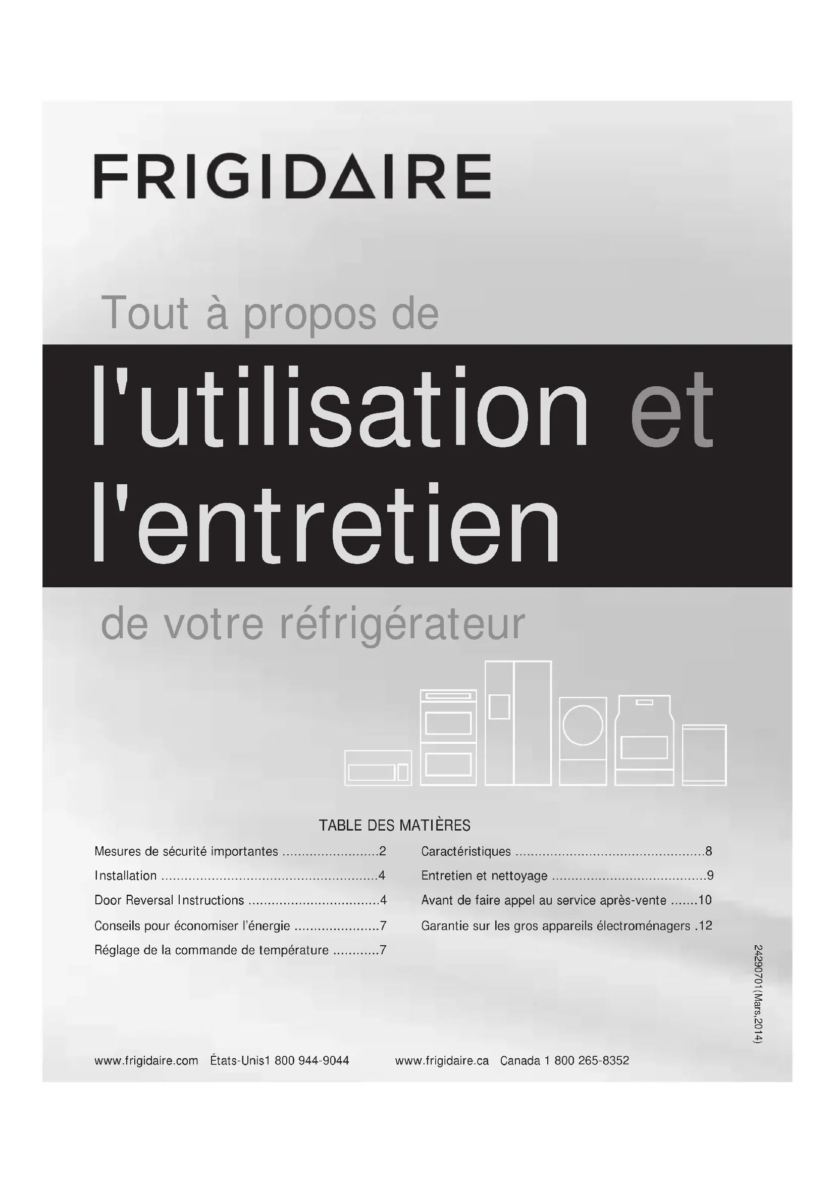 - Electrolux Canada Corp. 5855 Terry Fox Way Mississauga, Ontario, Canada L5V 3E4 Esta garantía sólo se aplica en los Estados Unidos y Canadá. En los EE.UU., su electrodoméstico está garantizado por Electrolux Major Appliances North America, una división de Electrolux Home Products, Inc. En Canadá, su electrodoméstico está garantizado por Electrolux Canada Corp. Electrolux no autoriza a ninguna persona a cambiar o agregar ninguna obligación bajo esta garantía. Nuestras obligaciones de reparación y piezas bajo esta garantía deben ser realizadas por Electrolux o compañía de servicio autorizado. Las especicaciones o características del producto según se describen o ilustran están sujetas a cambio sin previo aviso.TABLE DES MATIÈRES www.frigidaire.com États-Unis1 800 944-9044 www.frigidaire.ca Canada 1 800 265-8352 Tout à propos de l'utilisation et l'entretien de votre réfrigérateur Mesures de sécurité importantes p. 2