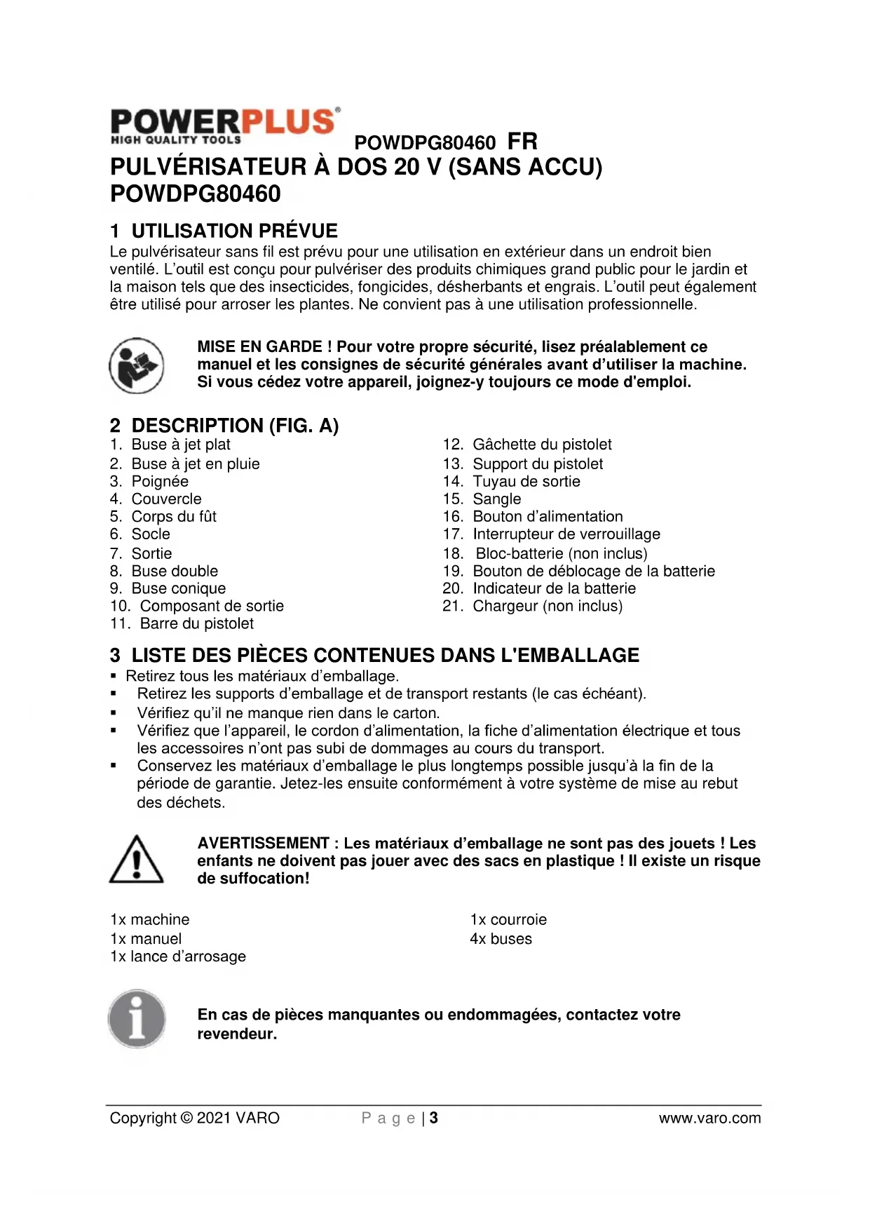 - Votre outil doit être chargé au moins 1 fois par mois afin de garantir un fonctionnement optimal de cet outil. 16 ENVIRONNEMENT Si votre appareil doit être remplacé, après une utilisation prolongée, ne vous en débarrassez pas avec les ordures ménagères, mais destinez-le à un traitement respectueux de l'environnement. Les outils électriques usagés ne peuvent être traités de la même manière que les ordures ménagères ordinaires. Procédez à leur recyclage, là où il existe des installations adéquates. Renseignez-vous à propos des procédés de collecte et de traitement auprès des autorités locales compétentes ou de votre revendeur.POWDPG80460 EN Copyright © 2021 VARO P a g e | 1 www.varo.com 1 INTENDED USE .............................................................................. 3