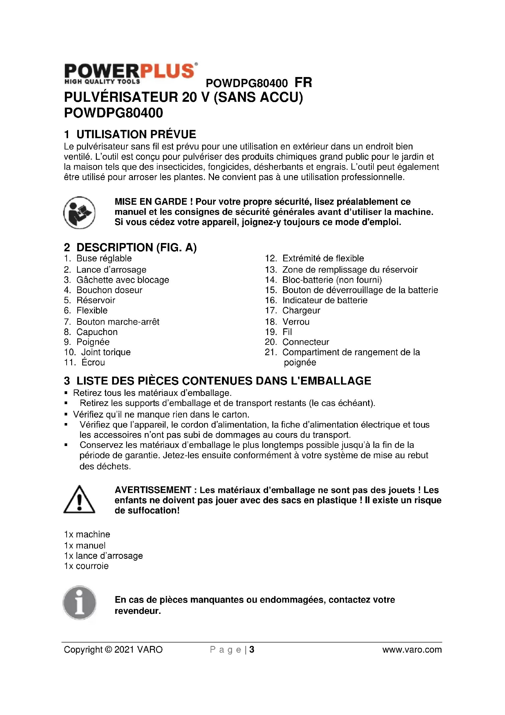 - Maintenez les enfants et les tierces personnes à l’écart lorsque vous utilisez l’outil électrique. Vous risquez de perdre le contrôle de l’appareil en cas de distraction.POWDPG80400 FR Copyright © 2021 VARO P a g e | 5 www.varo.com