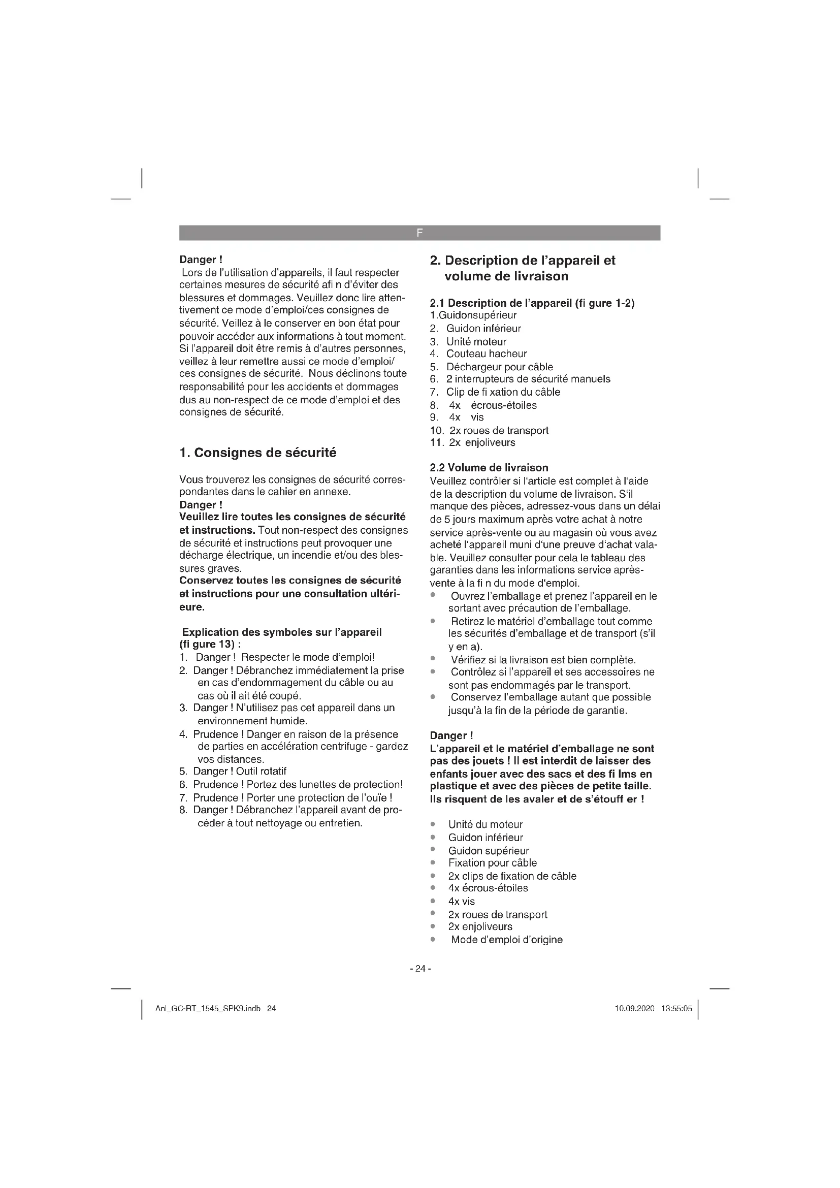 Uniquement pour les pays de l’Union Européenne Ne jetez pas les outils électriques dans les ordures ménagères! Selon la norme européenne 2012/19/CE relative aux appareils électriques et systèmes électroniques usés et selon son application dans le droit national, les outils électriques usés doivent être récoltés à part et apportés à un recyclage respectueux de l’environnement. Possibilité de recyclage en alternative à la demande de renvoi : Le propriétaire de l’appareil électrique est obligé, en guise d’alternative à un envoi en retour, à contribu- er à un recyclage eff ectué dans les règles de l’art en cas de cessation de la propriété. L’ancien appareil peut être remis à un point de collecte dans ce but. Cet organisme devra l’éliminer dans le sens de la Loi sur le cycle des matières et les déchets. Ne sont pas concernés les accessoires et ressources fournies sans composants électroniques. Toute réimpression ou autre reproduction de la documentation et des papiers joints aux produits, même sous forme d’extraits, est uniquement permise une fois l’accord explicite de l’Einhell Germany AG obte- nu. Sous réserve de modifi cations techniques Anl_GC-RT_1545_SPK9.indb 30Anl_GC-RT_1545_SPK9.indb 30 10.09.2020 13:55:0610.09.2020 13:55:06F