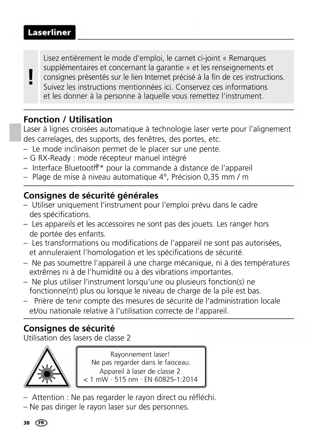 Consignes de sécurité générales – Utiliser uniquement l‘instrument pour l‘emploi prévu dans le cadre des spécications. – Les appareils et les accessoires ne sont pas des jouets. Les ranger hors de portée des enfants. – Les transformations ou modications de l’appareil ne sont pas autorisées, et annuleraient l’homologation et les spécications de sécurité. – Ne pas soumettre l’appareil à une charge mécanique, ni à des températures extrêmes ni à de l’humidité ou à des vibrations importantes. – Ne plus utiliser l‘instrument lorsqu‘une ou plusieurs fonction(s) ne fonctionne(nt) plus ou lorsque le niveau de charge de la pile est bas. – Prière de tenir compte des mesures de sécurité de l‘administration locale et/ou nationale relative à l‘utilisation correcte de l‘appareil. Rayonnement laser! Ne pas regarder dans le faisceau. Appareil à laser de classe 2 < 1 mW · 515 nm · EN 60825-1:2014 Consignes de sécurité Utilisation des lasers de classe 2 – Attention : Ne pas regarder le rayon direct ou rééchi. – Ne pas diriger le rayon laser sur des personnes. FR39 CompactCross-Laser Pro – Si le rayonnement laser de la classe 2 touche les yeux, fermez délibérément les yeux et tournez immédiatement la tête loin du rayon. – Il est interdit de manipuler (modier) le dispositif laser. – Ne jamais regarder le faisceau laser ni les réexions à l’aide d’instruments optiques (loupe, microscope, jumelles, etc.). Consignes de sécurité Comportement à adopter lors de rayonnements électromagnétiques Consignes de sécurité Comportement à adopter lors de rayonnements radio RF – L’appareil de mesure respecte les directives et les valeurs limites de la compatibilité électromagnétique selon la directive CEM 2014/30/UE, qui est couverte par la directive des équipements radio (RED) 2014/53/UE. – Il faut tenir compte des restrictions des activités par ex. dans les hôpitaux, les avions, les stations-services ou à proximité de personnes portant un stimulateur cardiaque. Les appareils électroniques peuvent être la source ou faire l‘objet de risques ou de perturbations. – L‘utilisation de l‘instrument de mesure à proximité de tensions élevées ou dans des champs alternatifs électromagnétiques forts peut avoir une inuence sur la précision de la mesure. – L‘appareil de mesure est doté d‘une interface radio. – L’appareil de mesure respecte les directives et les valeurs limites de la compatibilité et du rayonnement électromagnétiques selon la directive des équipements radio (RED) 2014/53/UE. – Umarex GmbH & Co. KG déclare par la présente que le type d’appareil radio CompactCross-Laser Pro est conforme aux principales exigences et aux autres dispositions de la directive européenne pour les équipements radioélectriques 2014/53/UE (RED). Il est possible de consulter le texte complet de la déclaration de conformité UE à l’adresse Internet suivante : http://laserliner.com/info?an=AHV Pour le transport, éteindre systématiquement tous les lasers et bloquer le balancier, faire glisser l’interrupteur MARCHE/ARRÊT (4) vers la droite.