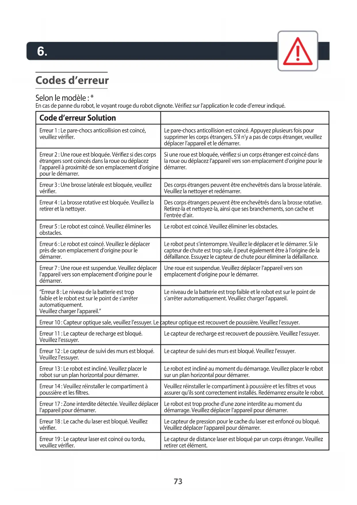 Codes d’erreur Selon le modèle: * En cas de panne du robot, le voyant rouge du robot clignote. Vérifiez sur l’application le code d’erreur indiqué. Code d’erreur Solution Erreur1: Le pare-chocs anticollision est coincé, veuillez vérifier. Le pare-chocs anticollision est coincé. Appuyez plusieurs fois pour supprimer les corps étrangers. S’il n’y a pas de corps étranger, veuillez déplacer l’appareil et le démarrer. Erreur2: Une roue est bloquée. Vérifiez si des corps étrangers sont coincés dans la roue ou déplacez l’appareil à proximité de son emplacement d’origine pour le démarrer. Si une roue est bloquée, vérifiez si un corps étranger est coincé dans la roue ou déplacez l’appareil vers son emplacement d’origine pour le démarrer. Erreur3: Une brosse latérale est bloquée, veuillez vérifier. Des corps étrangers peuvent être enchevêtrés dans la brosse latérale. Veuillez la nettoyer et redémarrer. Erreur4: La brosse rotative est bloquée. Veuillez la retirer et la nettoyer. Des corps étrangers peuvent être enchevêtrés dans la brosse rotative. Retirez-la et nettoyez-la, ainsi que ses branchements, son cache et l’entrée d’air. Erreur5: Le robot est coincé. Veuillez éliminer les obstacles. Le robot est coincé. Veuillez éliminer les obstacles. Erreur6: Le robot est coincé. Veuillez le déplacer près de son emplacement d’origine pour le démarrer. Le robot peut s’interrompre. Veuillez le déplacer et le démarrer. Si le capteur de chute est trop sale, il peut également être à l’origine de la défaillance. Essuyez le capteur de chute pour éliminer la défaillance. Erreur7: Une roue est suspendue. Veuillez déplacer l’appareil vers son emplacement d’origine pour le démarrer. Une roue est suspendue. Veuillez déplacer l’appareil vers son emplacement d’origine pour le démarrer. “Erreur8: Le niveau de la batterie est trop faible et le robot est sur le point de s’arrêter automatiquement. Veuillez charger l’appareil.” Le niveau de la batterie est trop faible et le robot est sur le point de s’arrêter automatiquement. Veuillez charger l’appareil. Erreur10: Capteur optique sale, veuillez l’essuyer. Le capteur optique est recouvert de poussière. Veuillez l’essuyer. Erreur11: Le capteur de recharge est bloqué. Veuillez l’essuyer. Le capteur de recharge est recouvert de poussière. Veuillez l’essuyer. Erreur12: Le capteur de suivi des murs est bloqué. Veuillez l’essuyer. Le capteur de suivi des murs est bloqué. Veuillez l’essuyer. Erreur13: Le robot est incliné. Veuillez placer le robot sur un plan horizontal pour démarrer. Le robot est incliné au moment du démarrage. Veuillez placer le robot sur un plan horizontal pour démarrer. Erreur14: Veuillez réinstaller le compartiment à poussière et les filtres. Veuillez réinstaller le compartiment à poussière et les filtres et vous assurer qu’ils sont correctement installés. Redémarrez ensuite le robot. Erreur17: Zone interdite détectée. Veuillez déplacer l’appareil pour démarrer. Le robot est trop proche d’une zone interdite au moment du démarrage. Veuillez déplacer l’appareil pour démarrer. Erreur18: Le cache du laser est bloqué. Veuillez vérifier. Le capteur de pression pour le cache du laser est enfoncé ou bloqué. Veuillez déplacer l’appareil pour démarrer. Erreur19: Le capteur laser est coincé ou tordu, veuillez vérifier. Le capteur de distance laser est bloqué par un corps étranger. Veuillez retirer cet élément.74