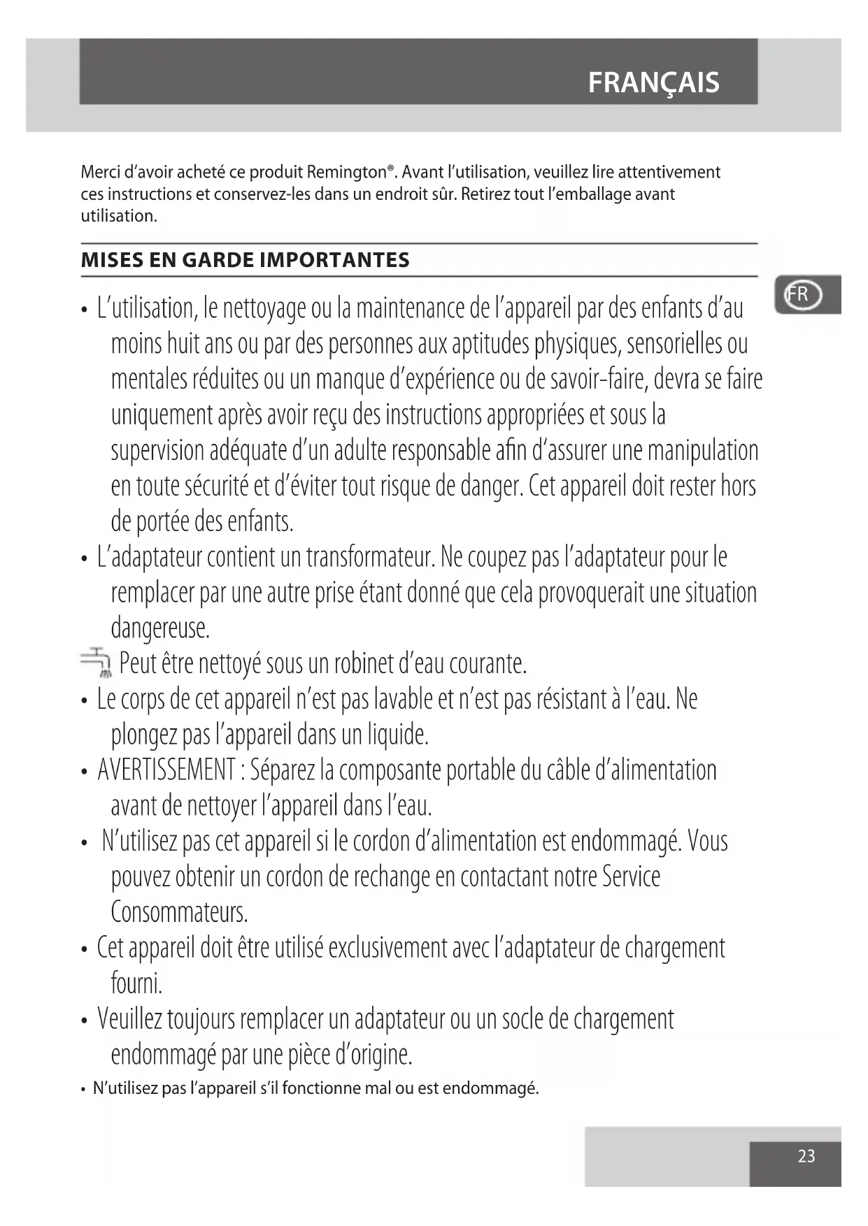 Merci d’avoir acheté ce produit Remington®. Avant l’utilisation, veuillez lire attentivement ces instructions et conservez-les dans un endroit sûr. Retirez tout l’emballage avant utilisation.