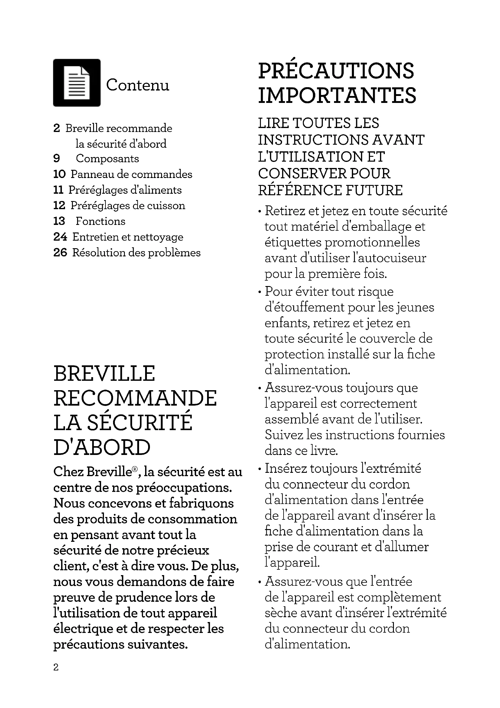 - Assurez-vous que l'entrée de l'appareil est complètement sèche avant d'insérer l'extrémité du connecteur du cordon d'alimentation. 2 Breville recommande la sécurité d'abord 9 Composants 10 Panneau de commandes 11 Préréglages d'aliments 12 Préréglages de cuisson 13 Fonctions 24 Entretien et nettoyage 26 Résolution des problèmes3 AVERTISSEMENT Utilisez uniquement le récipient de cuisson conçu pour cet appareil. L'utilisation d'un récipient autre que celui fourni peut entraîner un problème qui ne sera pas résolu par la réinitialisation de l'appareil.