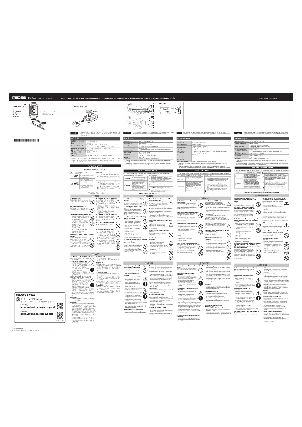 - Utilisez uniquement le type spécié (CR2032) de pile lithium. Veillez à l’insérer comme indiqué (pour respecter la polarité correcte).• La pile lithium usagée doit être mise au rebut conformément à la réglementation en vigueur dans votre région.Manipulez la pile qui fuit avec soin• Ne touchez pas le liquide à mains nues.• Si le liquide provenant de la batterie entre en contact avec vos yeux, vous risquez de perdre la vue. Ne vous frottez pas les yeux et rincez-les abondamment à l’eau. Ensuite, consultez rapidement un médecin.• Si du liquide s’est répandu sur votre peau ou sur vos vêtements, il peut entraîner des brûlures cutanées ou une dermatite. Rincez abondamment les zones touchées avec de l’eau. Ensuite, consultez rapidement un médecin.• À l’aide d’un chion doux, essuyez doucement tout liquide résiduel du compartiment interne de la pile. Installez ensuite une nouvelle pile.Alimentation électrique : Utilisation de la batterie• La durée de vie de la pile fournie peut être limitée, son but principal étant de permettre les tests.Installation Cet appareil peut interférer avec la réception radio et télévision. Ne l’utilisez pas à proximité de ce type de récepteurs.• En cas de déplacement d’un endroit vers un autre où la température et/ou l’humidité sont très diérentes, des gouttelettes d’eau (condensation) peuvent se former à l’intérieur de l’appareil. L’appareil peut alors présenter des dysfonctionnements ou des dégâts si vous essayez de l’utiliser dans ces conditions. Avant de vous en servir, il convient d’attendre quelques heures, jusqu’à ce que la condensation soit complètement évaporée.• Ne laissez pas cet appareil raccordé à la guitare ou à la basse pendant une trop longue période. Selon le revêtement de la guitare ou de la basse, le matériau de revêtement peut perdre son toucher.Entretien• N’utilisez jamais d’essence, de diluant, d’alcool ou de solvants an d’éviter tout risque de décoloration et/ou de déformation.Précautions supplémentaires• Ne frappez jamais l’écran ou ne lui appliquez jamais de fortes pressions.• Lors de la mise au rebut du carton d’emballage ou du matériau de protection dans lequel cet appareil a été emballé, respectez les réglementations d’élimination des déchets qui s’appliquent à votre localité.• Lorsque la pile est presque déchargée, le voyant de l’appareil s’assombrit. Remplacez la pile dès que possible.Droit de propriété intellectuelle• Roland et BOSS sont des marques déposées ou des marques commerciales de Roland Corporation aux États-Unis ou dans d’autres pays.• Les noms de société et les noms de produits apparaissant dans ce document sont des marques déposées ou des marques commerciales de leurs propriétaires respectifs. Fiche technique Plage d’accordage A0 (27,5 Hz) à C8 (4 186,0 Hz)Diapason de référence A4 (430 à 450 Hz)Mode d’accordageChromatique/Guitare/Basse/UkuléléAccordage en bémol : de normal jusqu’à 2 demi-tons plus basDurée de vie prévue de la batterie en utilisation continueEnviron 24 heures* Ce chire varie en fonction des conditions réelles d’utilisation.Alimentation électrique 1 pile au lithium type CR2032Dimensions 28 (L) x 38 (P) x 50 (H) mmPoids 25 gAccessoires Mode d’emploi, pile au lithium CR2032* Cet appareil s’éteint automatiquement après une période d’inactivité d’environ cinq minutes (arrêt automatique).* Ce document explique les spécications du produit au moment de la publication du document. Pour les dernières informations, reportez-vous au site Web de Roland.'21. 04. 01 現在ホームページをご覧くださいRoland製品 https://roland.cm/roland_support