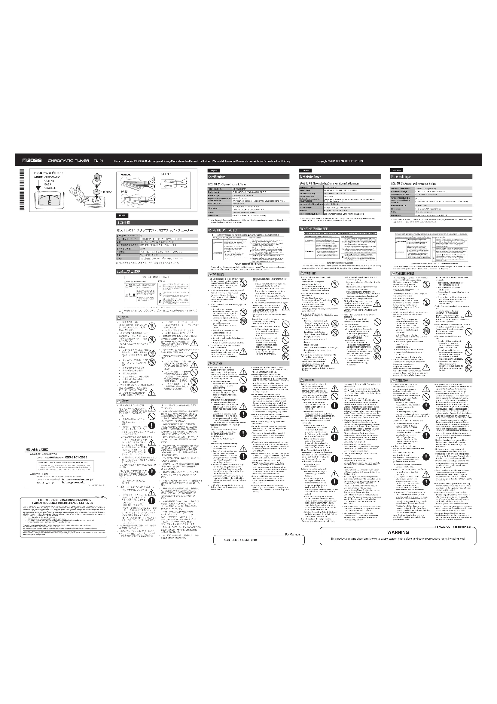 - Manipulez les piles avec soinUne utilisation incorrecte des piles peut entraîner une explosion ou des fuites et provoquer des dommages ou des blessures. Pour votre propre sécurité, lisez et respectez les consignes suivantes.• Retirez les piles lorsque l’appareil doit rester inutilisé pendant une période prolongée.• Ne stockez jamais les piles avec des objets métalliques, comme des stylos à bille, des colliers, des épingles à cheveux, etc.• Manipulez les piles lithium avec soin• Utilisez uniquement le type spécié (CR2032) de piles lithium. Veillez à les insérer comme indiqué (pour respecter la polarité correcte).• Les piles lithium usagées doivent être mises au rebut conformément à la réglementation en vigueur dans votre région.• Veillez à garder les pièces de petite dimension hors de portée des jeunes enfantsPour éviter toute ingestion accidentelle des pièces mentionnées ci-après, veillez à les garder à tout moment hors de portée des jeunes enfants.• Pièces amovibles: couvercle du compartiment à piles• Manipulez avec soin des piles qui fuient• Ne touchez pas le liquide à mains nues.• Si le liquide provenant de la pile entre en contact avec vos yeux, vous risquez de perdre la vue. Ne vous frottez pas les yeux et rincez-les abondamment à l’eau. Ensuite, consultez rapidement un médecin.• Si du liquide s’est répandu sur votre peau ou sur vos vêtements, il peut entraîner des brûlures cutanées ou une dermatite. Rincez abondamment les zones touchées avec de l’eau. Ensuite, consultez rapidement un médecin.• À l’aide d’un chion doux, essuyez doucement tout liquide résiduel du compartiment interne de la pile. Installez ensuite de nouvelles piles.• La durée de vie des piles fournies peut être limitée, leur but principal étant de permettre les tests.• Cet appareil peut interférer avec la réception radio et télévision. Ne l’utilisez pas à proximité de ce type de récepteurs.• Un bruit peut se faire entendre si des appareils de communication sans l, tels que des téléphones cellulaires, sont utilisés à proximité de l’appareil. Ce bruit peut se produire lors de la réception ou de l’émission d’un appel ou pendant une conversation téléphonique. Lorsque vous rencontrez ce genre de problèmes, vous devez soit déplacer les appareils sans l concernés de façon à les éloigner susamment de l’appareil, soit les éteindre.• En cas de déplacement d’un endroit vers un autre où la température et/ou l’humidité sont très diérentes, des gouttelettes d’eau (condensation) peuvent se former à l’intérieur de l’appareil. L’appareil peut alors présenter des dysfonctionnements ou des dommages si vous essayez de l’utiliser dans ces conditions. Avant de vous en servir, il convient d’attendre quelques heures, jusqu’à ce que la condensation soit complètement évaporée.• N’utilisez jamais de benzine, de diluant, d’alcool ou de solvants an d’éviter tout risque de décoloration et/ou de déformation.• Ne frappez jamais l’écran ou ne lui appliquez jamais de fortes pressions.• Lorsque la pile est proche d’être épuisée, la luminosité de l’écran de l’appareil faiblit. Remplacez les piles dès que possible.• L’appareil est automatiquement mis hors tension après que sept minutes se sont écoulées depuis sa mise sous tension (fonction Auto O).• Si vous manipulez les piles incorrectement, il peut se produire une explosion ou une fuite de liquide. Veillez à respecter scrupuleusement toutes les consignes relatives aux piles dans les « CONSIGNES DE SÉCURITÉ ».• Cet appareil ne doit pas être raccordé trop longtemps à la guitare ou à la basse. Selon le revêtement de la guitare ou de la basse, celui-ci peut être altéré.• MMP (Moore Microprocessor Portfolio) désigne un portefeuille de brevets relatifs à l’architecture de microprocesseur et a été développé par Technology Properties Limited (TPL). Roland utilise cette technologie sous licence de TPL Group.• Roland et BOSS sont des marques déposées ou des marques de Roland Corporation aux États-Unis et/ou dans d’autres pays.• Les noms de sociétés et les noms de produits mentionnés dans ce document sont des marques ou des marques déposées de leurs propriétaires respectifs. Fiche technique BOSS TU-01: Accordeur chromatique à pince Diapason de référence A4 (440 Hz uniquement)Mode d’accordage CHROMATIC / GUITAR / BASS / UKULELEAlimentation électrique Pile au lithium CR2032 x 1Autonomie prévisible des piles en utilisation continue25 heures(Ce chire varie en fonction des conditions réelles d’utilisation.)Fonction Auto O Environ 7 min.Dimensions 56.0 (L) x 31.0 (P) x 32.0 (H) mmPoids 30 g (pile comprise)Accessoires Mode d’emploi, Pile au lithium CR2032* Dans l’intérêt de l’amélioration du produit, les caractéristiques, l’aspect et/ou le contenu de cet appareil sont sujets à des modications sans préavis.Français'16. 04. 01 現在(Roland)製品に関するお問い合わせ先050-3101-2555ローランド・ホームページhttp://www.roland.co.jp/電話受付時間: 月曜日~金曜日 10:00~17:00(弊社規定の休日を除く)※IP電話からおかけになって繋がらない場合には、お手数ですが、電話番号の前に“0000” (ゼロ4回)をつけてNTTの一般回線からおかけいただくか、携帯電話をご利用ください。※上記窓口の名称、電話番号等は、予告なく変更することがありますのでご了承ください。お問い合わせの窓口最新サポート情報製品情報、イベント/キャンペーン情報、サポートに関する情報などローランドお客様相談センターボス・ホームページhttp://jp.boss.info/For the USAFEDERAL COMMUNICATIONS COMMISSIONRADIO FREQUENCY INTERFERENCE STATEMENT This equipment has been tested and found to comply with the limits for a