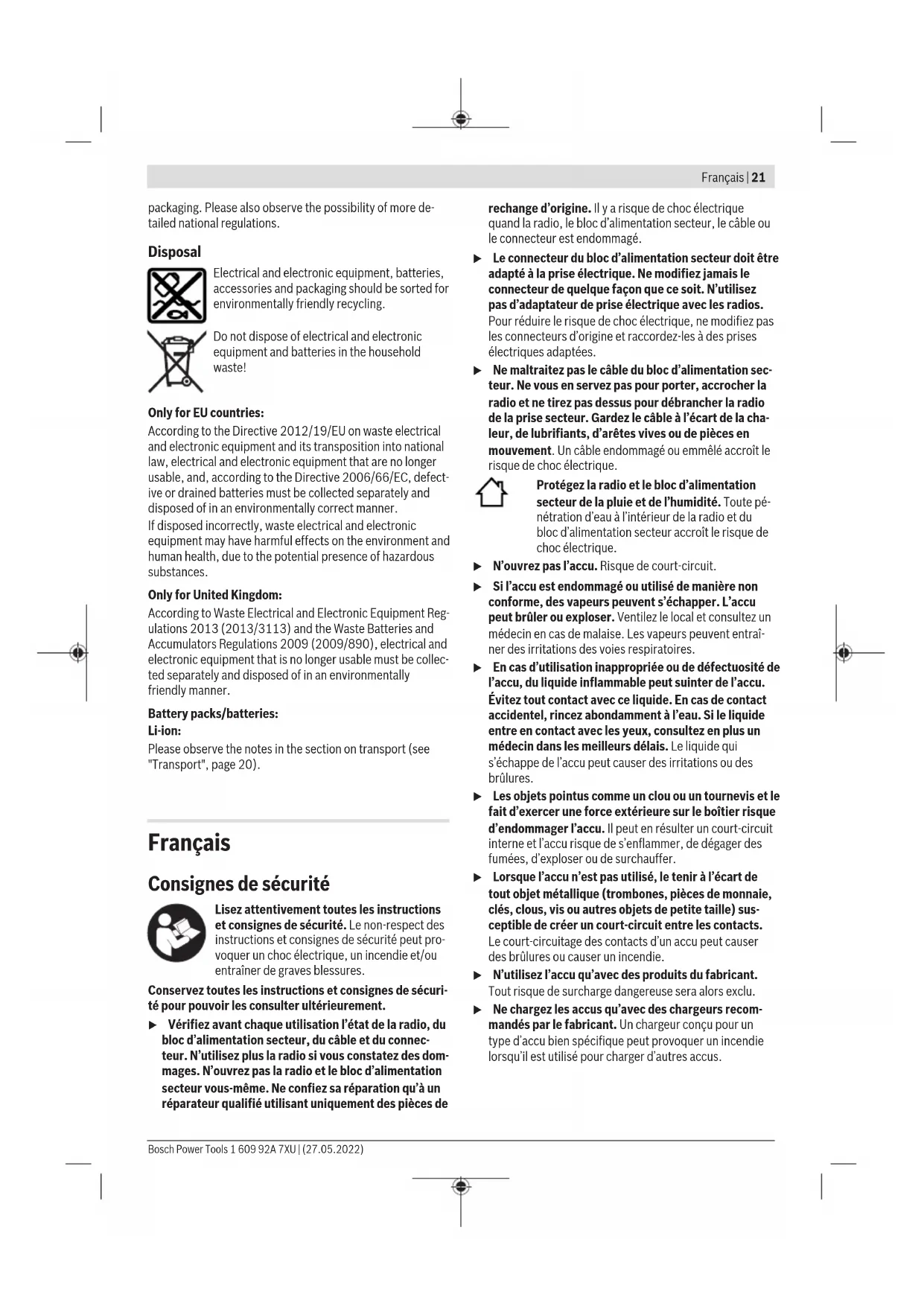 Vous trouverez d’autres caractéristiques techniques à l’adresse suivante: https://www.bosch-professional.com/ecodesign Alimentation en énergie de la radio La radio peut être alimentée en énergie au moyen d’un accu Lithium-Ion(17) ou au moyen du bloc d’alimentation secteur(20). Fonctionnement avec accu u N’utilisez que les chargeurs indiqués dans les Caracté- ristiques techniques. Ces chargeurs sont les seuls à être adaptés à l’accu Lithium-Ion de votre radio. Remarque : L’utilisation d’accus non conçus pour votre ra- dio peut entraîner des dysfonctionnements ou endommager la radio. Bosch Power Tools 1 609 92A 7XU | (27.05.2022)24 | Français L’accu Lithium-Ion est protégé contre les décharges com- plètes par l’électronique de protection des cellules [«Elec- tronic Cell Protection (ECP)»]. Quand l’accu est déchargé, un circuit de protection désactive automatiquement la radio. u Ne rallumez pas la radio après l’entrée en action du circuit de protection. L’accu risquerait d’être endomma- gé. Changement de l’accu Ouvrez le levier de déverrouillage(13) du couvercle d’accu et ouvrez le couvercle d’accu(12) en le rabattant vers l’ar- rière. Pour retirer l’accu, appuyez sur la touche de déverrouillage(16) de l’accu et retirez ce dernier de son lo- gement. Ne forcez pas. Pour mettre en place l’accu, insérez-le dans le logement d’accu(14) de façon à ce que ses connexions électriques coïncident avec les connexions dans le logement. Veillez à ce que l’accu s’enclenche. Refermez le couvercle d’accu(12) et verrouillez-le. Indicateur d’état de charge de l’accu Quand l’accu se trouve dans le logement, le niveau de charge de l’accu(17) est visible sur l’écran, sinon sur l’accu lui- même. Affichage de l’état de charge de l’accu sur l’écran L’affichage d’état de charge de l’accu(i) apparaît sur l’écran dès qu’un accu ayant une tension suffisante est inséré dans le logement, à condition toutefois que la radio ne soit pas ali- mentée en tension au moyen du bloc d’alimentation secteur(20). Affichage Capacité 80−100 % 60−80 % 40−60 % 20−40 % 5−20 % 0−5 % Indicateur de niveau de charge sur l’accu Les LED vertes de l’indicateur d’état de charge de l’accu per- mettent de vérifier le niveau de charge de l’accu après l’avoir extrait de la radio. Pour afficher le niveau de charge, appuyez sur le bouton de l’indicateur de niveau de charge ou . Si aucune LED ne s’allume après avoir appuyé sur le bouton de l’indicateur d’état de charge, l’accu est défectueux et doit être remplacé. Batterie de type GBA 18V... LED Capacité 3 LED allumées en vert 60–100% 2 LED allumées en vert 30–60% 1 LED allumée en vert 5–30% Clignotement en vert d'1 LED 0–5% Batterie de type ProCORE18V... LED Capacité 5 LED allumées en vert 80−100 % 4 LED allumées en vert 60−80 % 3 LED allumées en vert 40−60 % 2 LED allumées en vert 20−40 % 1 LED allumée en vert 5−20 % Clignotement en vert d’1 LED 0−5 % Fonctionnement avec bloc d’alimentation secteur (voirfigureA) u N’utilisez que les blocs d’alimentation secteur indi- qués dans les Caractéristiques techniques. Ce sont les seuls à garantir un fonctionnement correct de la radio. u Tenez compte de la tension du secteur! La tension du secteur doit correspondre aux indications se trouvant sur la plaque signalétique du bloc d’alimentation secteur. Ouvrez le cache protecteur du logement des connexions(15). Logez la fiche(21) du bloc d’alimentation secteur dans la prise(22) (DCIN18V). Branchez le bloc d’alimentation secteur sur une prise de courant. Pour éviter la pénétration de poussières, remettez en place le cache protecteur du logement des connexions(15) aussi- tôt après avoir débranché le bloc d’alimentation secteur(21). Changement de la pile bouton Pour conserver en mémoire l’heure et d’autres réglages, la radio est dotée d’une pile bouton faisant office de pile tam- pon. Avant la première utilisation de la radio, il convient de retirer la bande isolante de la pile bouton. Ouvrez le levier de déverrouillage(13) du couvercle d’accu et ouvrez le couvercle d’accu(12) en le rabattant vers l’ar- rière. Retirez l’accu(17) éventuellement inséré dans le logement. Retirez la bande isolante placée sous le couvercle(18) de la pile bouton. 1 609 92A 7XU | (27.05.2022) Bosch Power ToolsFrançais | 25 Si l’heure de la radio n’est plus mémorisée et que les affi- chages sur l’écran deviennent moins visibles, il faut changer la pile bouton. Pour cela, dévissez le couvercle(18) de la pile bouton dans le sens antihoraire (avec une pièce de monnaie p. ex.) et re- tirez le couvercle. Insérez une nouvelle pile bouton. Respectez la polarité indiquée du côté intérieur du couvercle(18). Revissez le couvercle(18) de la pile bouton dans le sens ho- raire. Pour que le couvercle soit bien verrouillé, faites coïnci- der le marquage du couvercle et le marquage du symbole serrure. u Sortez la pile bouton de la radio si vous savez que la radio ne va pas être utilisée pendant une longue du- rée. La pile bouton risque sinon de se corroder et de se décharger. Utilisation u Protégez la radio contre tout contact direct avec de l’eau. Toute pénétration d’eau à l’intérieur de la radio ac- croît le risque de choc électrique. u Veillez à ce que le couvercle d’accu et le cache protec- teur du logement des connexions soient toujours fer- més. La radio est alors bien protégée contre l’eau et la poussière. Fonctionnement audio Mise en marche/arrêt Pour mettre en marche la radio, actionnez le bouton Marche/Arrêt(2). L’écran(1) s’allume et la source audio ré- glée lors de la dernière mise à l’arrêt de la radio est activée. L’écran(1) s’éclaire pendant quelques secondes à chaque actionnement d’une touche. Pour arrêter la radio, act