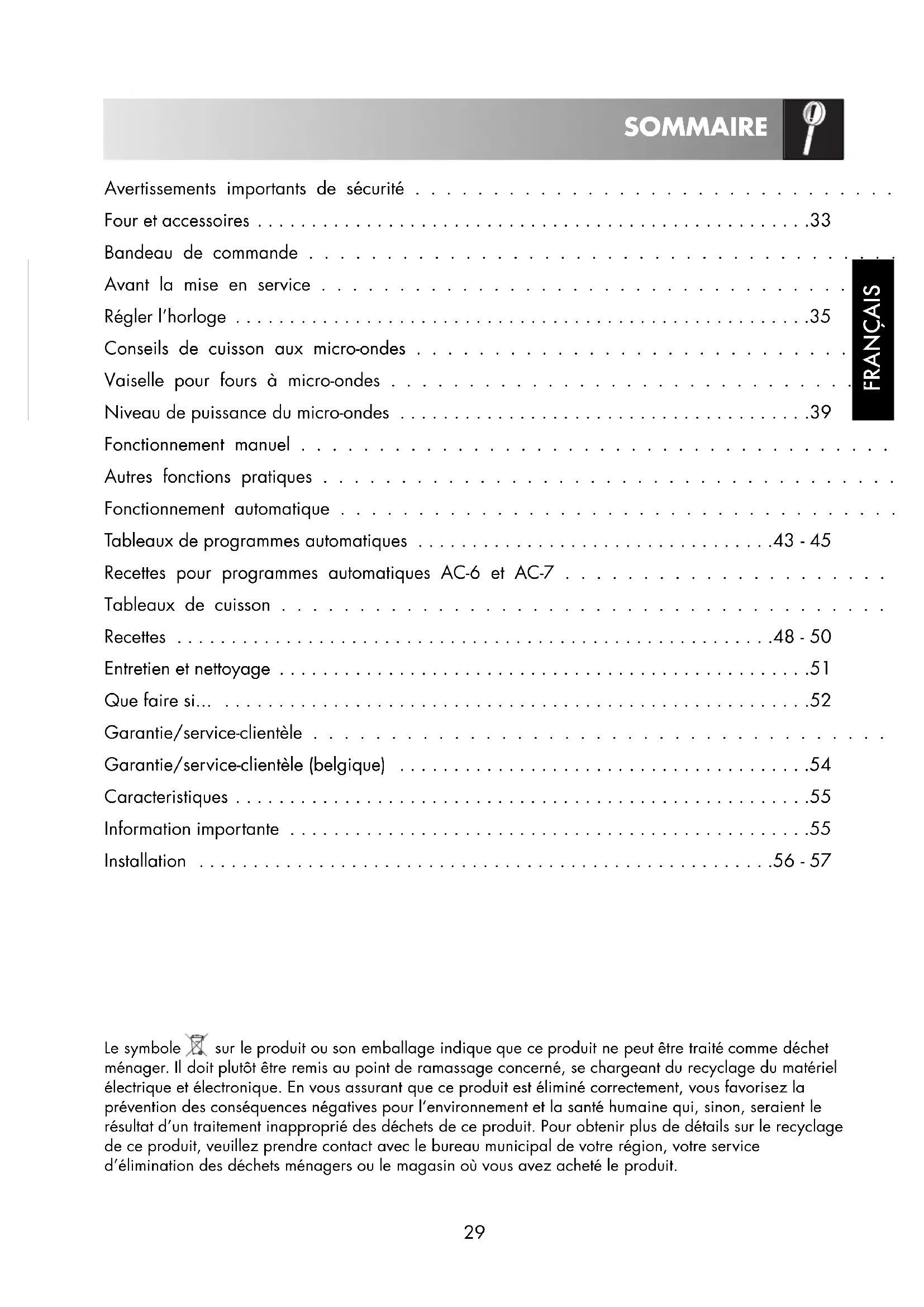 - The manufacturer declines any liability should this safety measure not be observed.29 SOMMAIRE FRANÇAIS Avertissements importants de sécurité p. 30
