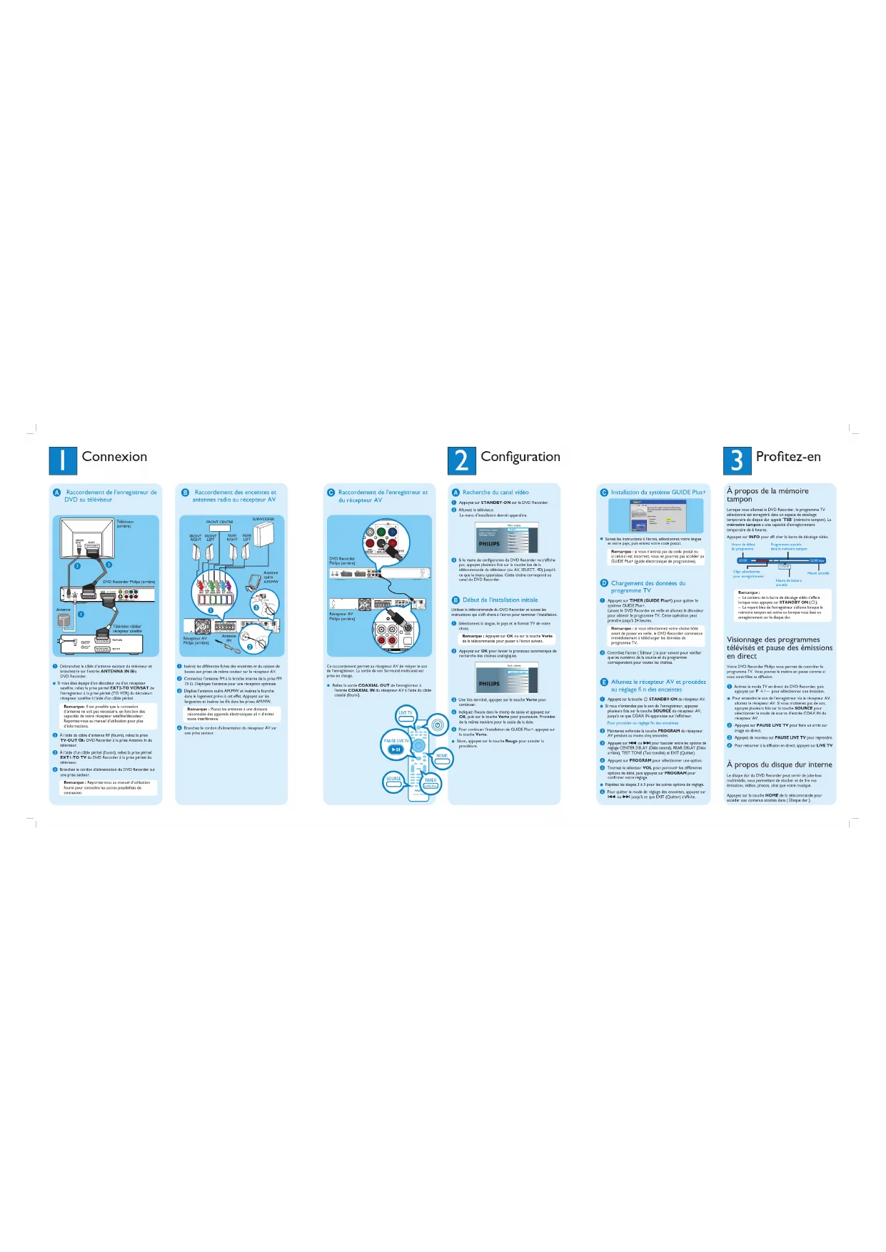 Raccordement de l’enregistreur de DVD au téléviseur A Débranchez le câble d’antenne existant du téléviseur et branchez-le sur l’entrée ANTENNA IN du DVD Recorder. Si vous êtes équipé d’un décodeur ou d’un récepteur satellite, reliez la prise péritel EXT2-TO VCR/SAT de l’enregistreur à la prise péritel (TO VCR) du décodeur/récepteur satellite à l’aide d’un câble péritel.Remarque: Il est possible que la connexion d’antenne ne soit pas nécessaire, en fonction des capacités de votre récepteur satellite/décodeur. Reportez-vous au manuel d’utilisation pour plus d’informations. B À l’aide du câble d’antenne RF (fourni), reliez la prise TV-OUT du DVD Recorder à la prise Antenna In du téléviseur. C À l’aide d’un câble péritel (fourni), reliez la prise péritel EXT1-TO TV du DVD Recorder à la prise péritel du téléviseur. D Branchez le cordon d’alimentation du DVD Recorder sur une prise secteur.Remarque : Reportez-vous au manuel d’utilisation fourni pour connaître les autres possibilités de connexion. A Insérez les différentes fiches des enceintes et du caisson de basses aux prises de même couleur sur le récepteur AV. B Connectez l’antenne FM à la broche interne de la prise FM 75 . Déployez l’antenne pour une réception optimale. C Dépliez l’antenne cadre AM/MW et insérez la fourche dans le logement prévu à cet effet. Appuyez sur les languettes et insérez les fils dans les prises AM/MW.Remarque : Placez les antennes à une distance raisonnable des appareils électroniques a n d’éviter toute interférence. D Branchez le cordon d’alimentation du récepteur AV sur une prise secteur.