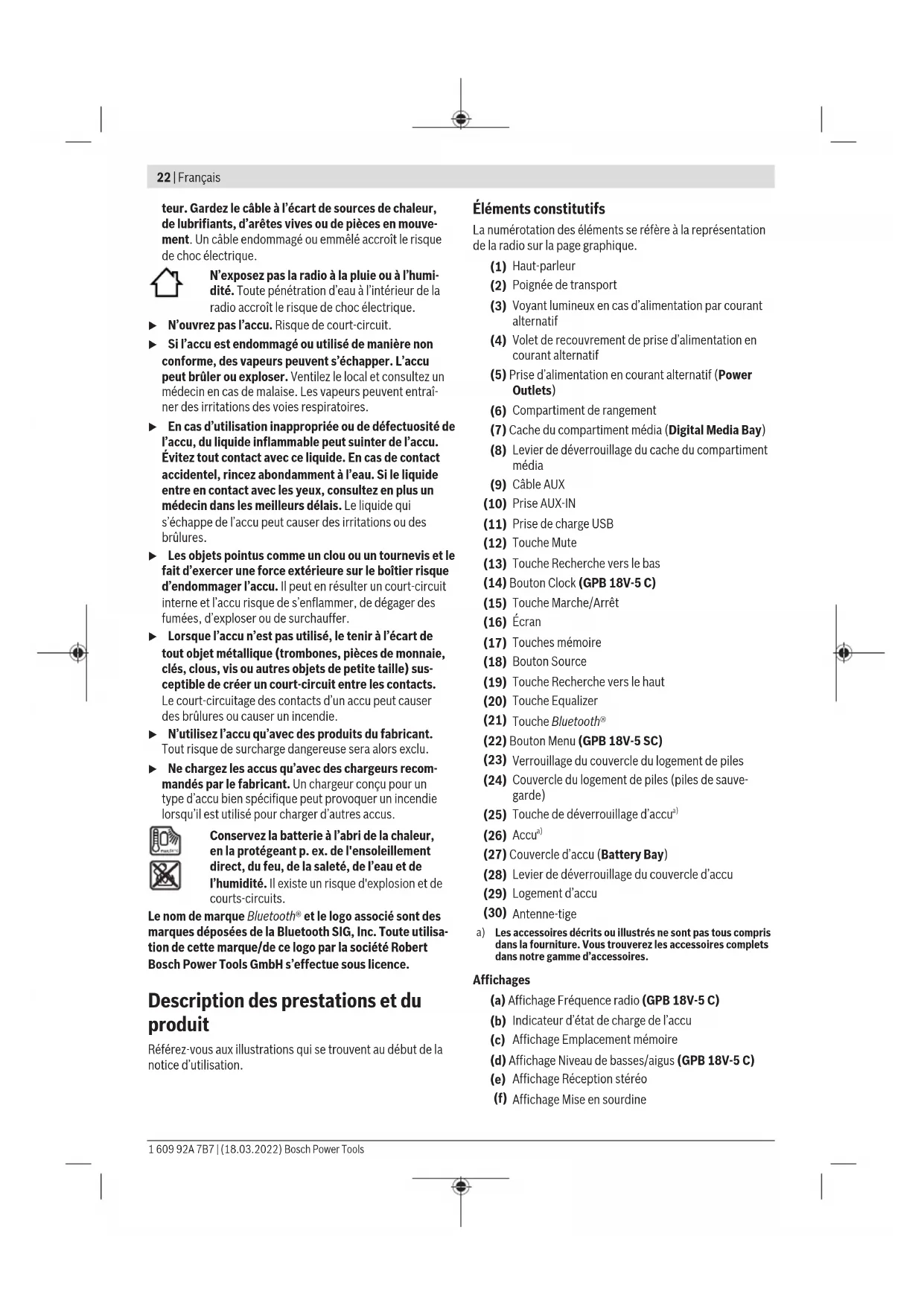 Les accessoires décrits ou illustrés ne sont pas tous compris dans la fourniture. Vous trouverez les accessoires complets dans notre gamme d’accessoires. Affichages (a) Affichage Fréquence radio (GPB18V‑5C) (b) Indicateur d’état de charge de l’accu (c) Affichage Emplacement mémoire (d) Affichage Niveau de basses/aigus (GPB18V‑5C) (e) Affichage Réception stéréo (f) Affichage Mise en sourdine 1 609 92A 7B7 | (18.03.2022) Bosch Power ToolsFrançais | 23 (g) Affichage Bluetooth® (h) Affichage Source audio (i) Préréglage du son (j) Affichage de l’heure (k) Affichage multifonctions (GPB18V‑5SC) Caractéristiques techniques Radio de chantier GPB 18V-5 C GPB 18V-5 SC Référence 3601DA40.. 3601DA41.. Réception DAB+ – ● Tension de service – pour alimentation par secteur V 230/110 230/110 – pour fonctionnement avec accu V 18 18 Puissance nominale de l’amplificateur W 4×5 4×5 Gamme de fréquences FM MHz 87,5−108 87,5−108 Gamme de fréquences DAB+ MHz − 174,928−239,200 Compatibilité Bluetooth® Bluetooth® 5.0 Bluetooth® 5.0 Plage de fréquences Bluetooth® MHz 2 402−2 480 2 402−2 480 Puissance d’émission maxi Bluetooth® mW 10 10 Piles de sauvegarde 2×1,5V LR6(AA) 2×1,5V LR6(AA) Poids selon EPTA-Procedure 01:2014 kg 9,2−10,2