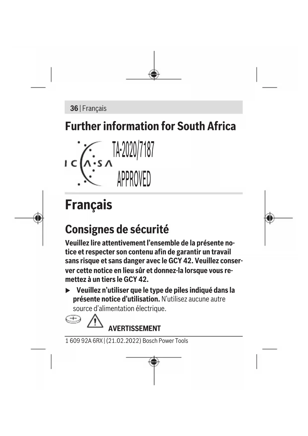 La portée peut varier sensiblement selon les conditions extérieures et le type de périphérique mobile utilisé. Dans une pièce fermée et à travers des barrières métalliques (par exemple, parois murales, étagères, coffres, etc.), la portée du Bluetooth® peut se trouver fortement réduite. Bosch Power Tools 1 609 92A 6RX | (21.02.2022)42 | Français Prérequis système GCY 42 Appareil mobile (tablette, smartphone) Android 6.0 (ou version ulté- rieure) iOS 11 (ou version ultérieure) Montage et mise en service Alimentation électrique u Enlevez le cache du Bluetooth® Low Energy Module GCY 42 sur l’outil électroportatif, p. ex. à l’aide d’un tourne- vis ou d’une grosse pièce de monnaie. L’utilisation d’ob- jets inappropriés peut endommager l’électronique ou le cache. – Pour la mise en service après l’achat ou après un change- ment de la pile (1), procédez comme représenté sur les pages graphiques. Respectez par ailleurs les informations qui suivent. Première mise en service (voir figures A1–A5) 1 609 92A 6RX | (21.02.2022) Bosch Power ToolsFrançais | 43 Remarque : Conservez bien le module factice (3) du module GCY 42. Remettez en place le module factice lorsque vous re- mettez à quelqu’un l’outil électroportatif sans GCY 42. Insérez la pile (1) dans le GCY 42 (2) avec le pôle positif orienté vers le haut. N’exercez pas de pression sur la pile ; elle ne s’enclenche pas. Elle ne se met dans la bonne position que lors de la fermeture du cache. Pour initialiser le GCY 42 après son insertion, actionnez l’inter- rupteur Marche/Arrêt de l’outil électroportatif. Remplacement de la pile (voir figures B1–B4) Retirez la pile usagée (1) seulement avec les doigts. Dans l’application mobile, un message d’avertissement signale quand la pile arrive en fin de vie. Retrait du module GCY 42 (voir figures C1–C2) Ne forcez pas pour retirer le GCY 42 (2). N’utilisez aucun objet pointu ou coupant. Remarque : Le retrait du GCY 42 peut être facilité en retour- nant l’outil électroportatif. Bosch Power Tools 1 609 92A 6RX | (21.02.2022)44 | Français Mise en marche Dès que la pile (1) a été insérée et que l’interrupteur Marche/ Arrêt de l’outil électroportatif a été actionné, le GCY 42 se met à émettre en continu un signal. Le signal Bluetooth® ne cesse d’être émis que quand la pile est déchargée, défectueuse ou a été retirée. Vous obtiendrez plus d’informations directement dans l’appli- cation mobile Bosch. Installation de l’application mobile Pour pouvoir utiliser le GCY 42, vous devez tout d’abord instal- ler l’application Bosch Toolbox. – Téléchargez l’application Bosch Toolbox sur une plate- forme de téléchargement (Apple App Store, Google Play Store). Remarque : Pour ce faire, vous devez disposer d’un compte utilisateur donnant accès à la plateforme de télécharge- ment. – Sélectionnez ensuite dans l’application le sous-menu My- Tools. 1 609 92A 6RX | (21.02.2022) Bosch Power ToolsFrançais | 45 – Sur l’écran de votre périphérique mobile (smartphone, ta- blette) sont alors indiquées toutes les étapes à suivre pour connecter l’outil électroportatif au périphérique. Remarque : Commencez par visionner intégralement le tuto- riel de l’application. Vous obtiendrez ainsi une bonne vue d’en- semble sur la procédure de connexion et l’utilisation des fonc- tions de connectivité. Transmission de données via Bluetooth® Le module GCY42 envoie un signal périodiquement. Le GCY 42 n’est parfois reconnu (dépend de l’environnement) qu’après l’envoi de plusieurs signaux. Si le GCY 42 n’est pas reconnu, vérifiez les points suivants: – La distance avec le périphérique mobile est-elle trop grande? Réduisez la distance entre le périphérique mobile et le GCY