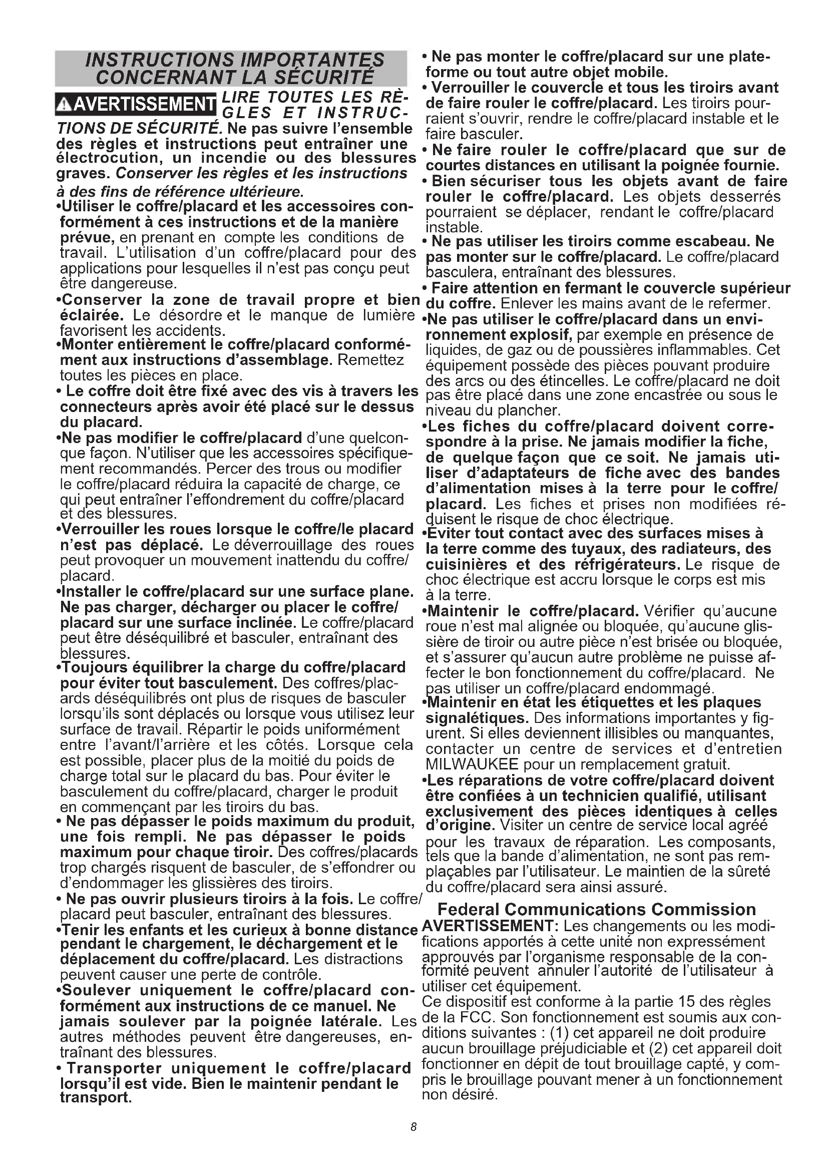 - Consulter le concessionnaire ou un technicien radio/ TV expérimenté pour obtenir de l’aide. PICTOGRAPHIE Avertissement Lire le manuel d’utilisation Danger de décharge électrique Ne pas ouvrir plusieurs tiroirs à la fois. Le core/placard peut basculer, entraînant des blessures. Ne pas utiliser les tiroirs comme escabeau. Ne pas monter sur le core/placard. Le core/placard basculera, entraînant des blessures. Le core doit être xé avec des vis à travers les connecteurs après avoir été placé sur le dessus du placard. Verrouiller les roues lorsque le core/le placard n’est pas déplacé. Le déverrouillage des roues peut provoquer un mouvement inattendu du core/placard. Ne pas utiliser les tiroirs comme escabeau. Ne pas monter sur le core/placard. Le coffre/placard peut basculer, entraînant des blessures. FPO Verrouiller le couvercle et tous les tiroirs avant de déplacer is core/plac SPECIFICATIONS Combo No de Cat ............................ 48-22-8556M Cabinet No de Cat ............................ 48-22-8557M Poitrine No de Cat ........................... 48-22-8558M Capacité du tiroir à deux glissières..............68,0 kg (150 lbs) Capacité du tiroir à quatre glissières .........136,0 kg (300 lbs) Capacité totale........................................1 360,8 kg (3 000 lbs) Tension d’alimentation CA .................................125 Hertz ....................................................................60 Watts ..............................................................1 875 Ampères ..............................................................15 Tension du port USB..............................................5 Intensité de courant du port USB .......................2,1 Température ambiante de fonctionnement recommandée ..........-15°C à 40°C (5°F à 104°F) DESCRIPTION FONCTIONNELLE