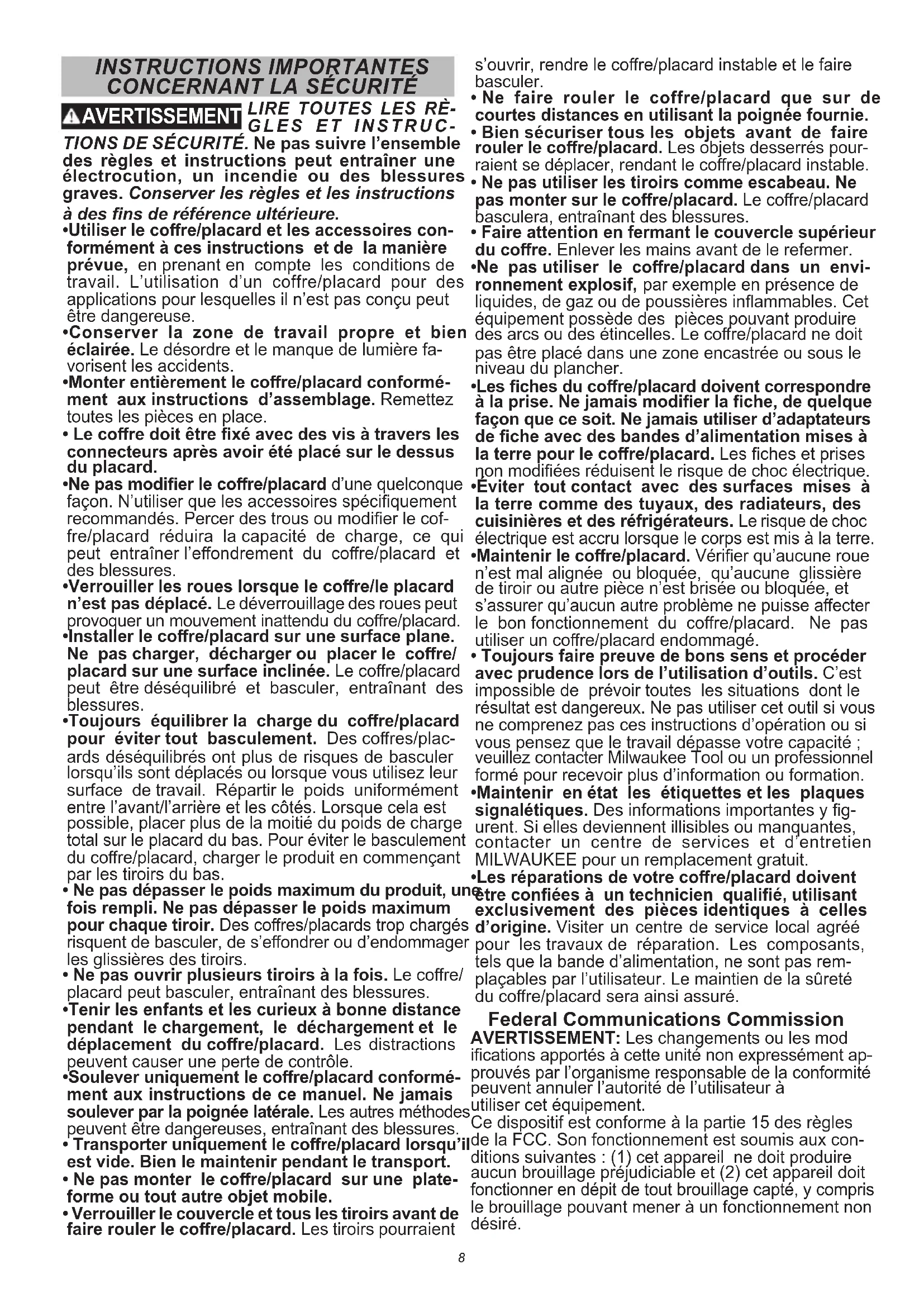 TIONS DE SÉCURITÉ. Ne pas suivre l'ensemble des règles et instructions peut entraîner une électrocution, un incendie ou des blessures graves. Conserver les règles et les instructions à des fins de référence ultérieure. - Utiliser le coffre/placard et les accessoires conformément à ces instructions et de la manière prévue, en tenant compte des conditions de travail. L'utilisation d'un coffre/placard pour des applications pour lesquelles il n'est pas conçu peut être dangereuse. - Conserver la zone de travail propre et bien éclairée. Le désordre et le manque de lumière favorisent les accidents. - Monter entièrement le coffre/placard conformément aux instructions d'assemblage. Remettre toutes les pièces en place. - Le coffre doit être fixé avec des vis à travers les connecteurs après avoir été placé sur le dessus du placard. - Ne pas modifier le coffre/placard d'une quelconque façon. N'utiliser que les accessoires spécifiquement recommandés. Percer des trous ou modifier le coffre/placard réduira la capacité de charge, ce qui peut entraîner l'effondrement du coffre/placard et des blessures. - Verrouiller les roues lorsque le coffre/le placard n'est pas déplacé. Le déverrouillage des roues peut provoquer un mouvement inattendu du coffre/placard. - Installer le coffre/placard sur une surface plane. Ne pas charger, décharger ou placer le coffre/placard sur une surface inclinée. Le coffre/placard peut être déséquilibré et basculer, entraînant des blessures. - Toujours équilibrer la charge du coffre/placard pour éviter tout basculement. Des coffres/placards déséquilibrés ont plus de risques de basculer lorsqu'ils sont déplacés ou lorsque vous utilisez leur surface de travail. Répartir le poids uniformément entre l'avant/l'arrière et les côtés. Lorsque cela est possible, placer plus de la moitié du poids de charge total sur le placard du bas. Pour éviter le basculement du coffre/placard, charger le produit en commençant par les tiroirs du bas. - Ne pas dépasser le poids maximum du produit, une fois rempli. Ne pas dépasser le poids maximum pour chaque tiroir. Des coffres/placards trop chargés risquent de basculer, de s'effondrer ou d'endommager les glissières des tiroirs. - Ne pas ouvrir plusieurs tiroirs à la fois. Le coffre/placard peut basculer, entraînant des blessures. - Tenir les enfants et les curieux à une distance pendant le chargement, le déchargement et le déplacement du coffre/placard. Les distractions peuvent causer une perte de contrôle. - Soulever uniquement le coffre/placard conformément aux instructions de ce manuel. Ne jamais soulever par la poignée latérale. Les autres méthodes peuvent être dangereuses, entraînant des blessures. - Transporter uniquement le coffre/placard lorsqu'il est vide. Bien le maintenir pendant le transport. - Ne pas monter le coffre/placard sur une plate-forme ou tout autre objet mobile. - Verrouiller le couvercle et tous les tiroirs avant de faire rouler le coffre/placard. Les tiroirs pourraient