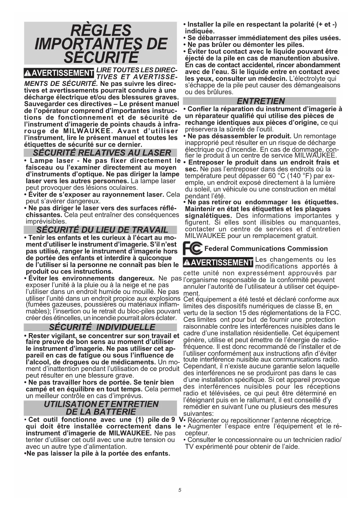 MENTS DE SÉCURITÉ. Ne pas suivre les direc- tives et avertissements pourrait conduire à une décharge électrique et/ou des blessures graves. Sauvegarder ces directives – Le présent manuel de l’opérateur comprend d’importantes instruc- tions de fonctionnement et de sécurité de l’instrument d’imagerie de points chauds à infra- rouge de MILWAUKEE. Avant d’utiliser l’instrument, lire le présent manuel et toutes les étiquettes de sécurité sur ce dernier.