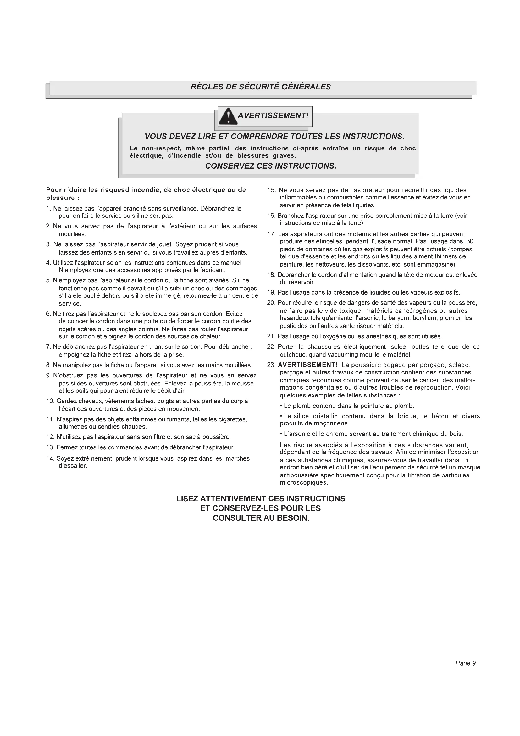 CONSULTER AU BESOIN. VOUS DEVEZ LIRE ET COMPRENDRE TOUTES LES INSTRUCTIONS. Le non-respect, même partiel, des instructions ci-après entraîne un risque de choc électrique, d'incendie et/ou de blessures graves. CONSERVEZ CES INSTRUCTIONS. AVERTISSEMENT!