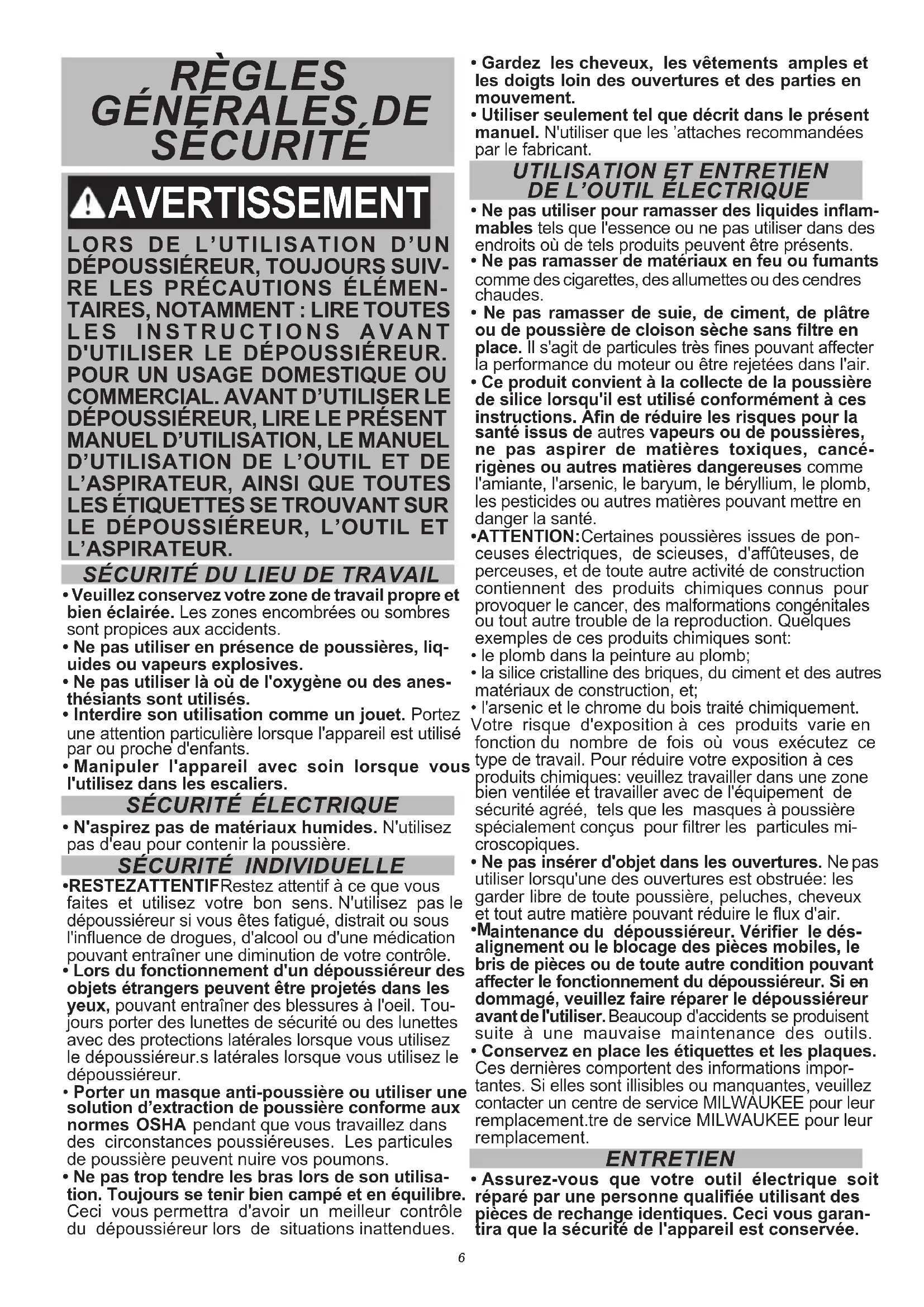 TECHTRONIC INDUSTRIES' garantit le produit pendant 5 ans à partir de la date d’achat d’origine. Le présent bon de garantie couvre tous les vices de matériau et de fabrication que peut acher ce produit. Pour assurer la validité de la présente garantie, veuillez présenter ce bon de garantie, estampillé du sceau du distributeur ou du magasin où le produit a été acheté, au centre de réparations agréé. Si le bon de garantie n’a pas été estampillé, veuillez fournir la preuve d’achat d’origine au centre de réparations agréé.Pour un entretien des pièces, des accessoires ou des composants, composer sans frais le 1-800-030-7777 an d’obtenir les coordonnées du centre de réparations agréé le plus prèsProcédure pour assurer la validité de la garantiePrésenter le produit au centre de réparations agréé, accompagné du bon de garantie estampillé du sceau du distributeur ou du magasin où le produit a été acheté. Toute pièce défectueuse ou tout composant défectueux sera remplacé(e) sans frais. Milwaukee assume tous les frais de transport liés à ce processus de garantie.ExceptionsCette garantie ne s’applique pas dans les situations suivantes :a) Si le produit a été utilisé pour une n autre que celle indiquée dans le guide de l’utilisateur nal ou le manuel d’instructions.b) Si les conditions d’utilisations ne sont pas habituelles.c) Si le produit a été modié ou réparé par une personne non autorisée par TECHTRONIC INDUSTRIES.Remarque : Si le cordon électrique est endommagé, il doit être remplacé par un centre de réparations agréé pour éviter les risques d’électrocution.CENTRE DE RÉPARATIONS ET DE SERVICEComposer le 01 (800) 030-7777IMPORTÉ ET COMMERCIALISÉ PAR T E C H T R O N I C I N D U S T R I E S , M E X I Q U E , S A D E C V Av President Masarik #29 piso 7, Col. Polanco V SecciónCP 11560, Deleg. Miguel Hidalgo, CDMX Modèle : Date d’achat : Sceau du distributeur ou du magasin : REGLAS DE SEGURIDAD GENERALES ADVERTENCIA A L UTILIZAR UN EXTRACTOR DE POLVO,