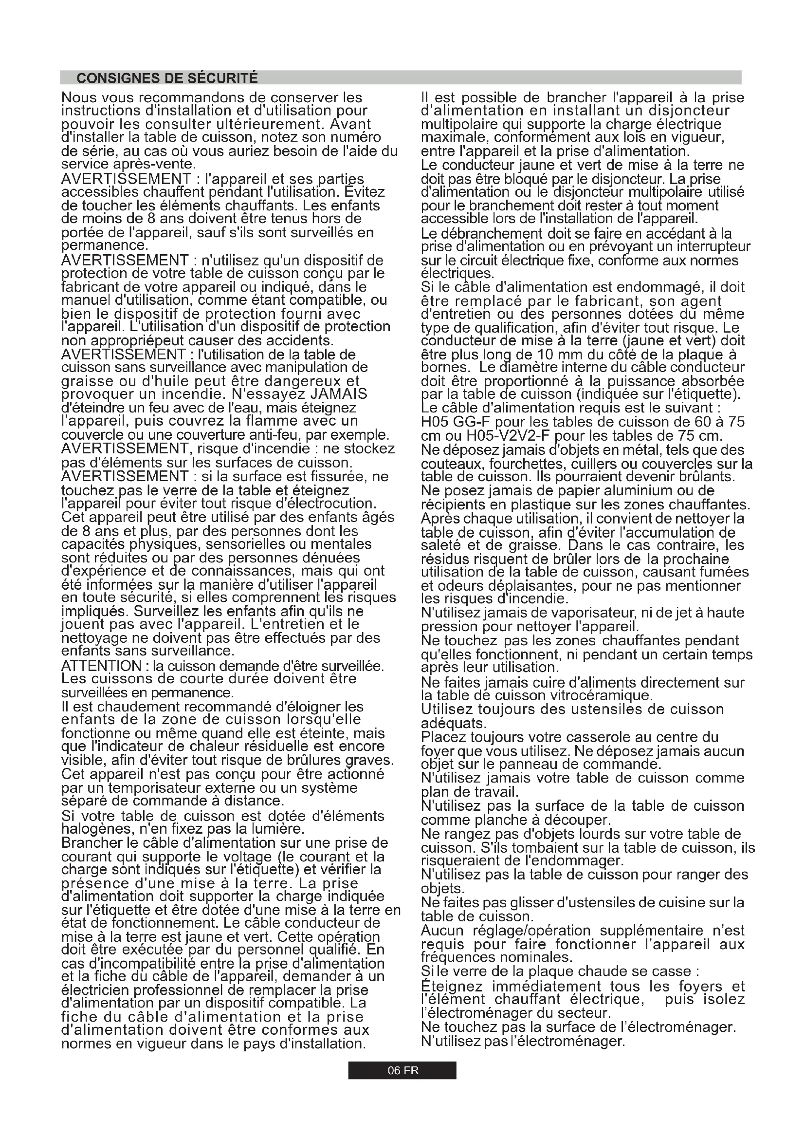 Il est possible de brancher l'appareil à la prise d'alimentation en installant un disjoncteur multipolaire qui supporte la charge électrique maximale, conformément aux lois en vigueur, entre l'appareil et la prise d'alimentation. Le conducteur jaune et vert de mise à la terre ne doit pas être bloqué par le disjoncteur. La prise d'alimentation ou le disjoncteur multipolaire utilisé pour le branchement doit rester à tout moment accessible lors de l'installation de l'appareil. Le débranchement doit se faire en accédant à la prise d'alimentation ou en prévoyant un interrupteur sur le circuit électrique fixe, conforme aux normes électriques. Si le câble d'alimentation est endommagé, il doit être remplacé par le fabricant, son agent d'entretien ou des personnes dotées du même type de qualification, afin d'éviter tout risque. Le conducteur de mise à la terre (jaune et vert) doit être plus long de 10 mm du côté de la plaque à bornes. Le diamètre interne du câble conducteur doit être proportionné à la puissance absorbée par la table de cuisson (indiquée sur l'étiquette). Le câble d'alimentation requis est le suivant : H05 GG-F pour les tables de cusson de 60 à 75 cm ou H05-V2V2-F pour les tables de 75 cm. Ne déposez jamais d'objets en métal, tels que des couteaux, fourchettes, cuillers ou couvercles sur la table de cuisson. Ils pourraient devenir brûlants. Ne posez jamais de papier aluminium ou de récipients en plastique sur les zones chauffantes. Après chaque utilisation, il convient de nettoyer la table de cuisson, afin d'éviter l'accumulation de saleté et de graisse. Dans le cas contraire, les résidus risquent de brûler lors de la prochaine utilisation de la table de cuisson, causant fumées et odeurs déplaisantes, pour ne pas mentionner les risques d'incendie. N'utilisez jamais de vaporisateur, ni de jet à haute pression pour nettoyer l'appareil. Ne touchez pas les zones chauffantes pendant qu'elles fonctionnent, ni pendant un certain temps après leur utilisation. Ne faites jamais cuire d'aliments directement sur la table de cuisson vitrocéramique. Utilisez toujours des ustensiles de cuisson adéquats. Placez toujours votre casserole au centre du foyer que vous utilisez. Ne déposez jamais aucun objet sur le panneau de commande. N'utilisez jamais votre table de cuisson comme plan de travail. N'utilisez pas la surface de la table de cuisson comme planche à découper. Ne rangez pas d'objets lourds sur votre table de cuisson. S'ils tombaient sur la table de cuisson, ils risqueraient de l'endommager. N'utilisez pas la table de cuisson pour ranger des objets. Ne faites pas glisser d'ustensiles de cuisine sur la table de cuisson. Aucun réglage/opératon supplémentare n’est requs pour fare fonctonner l’apparel aux fréquences nomnales. Sle verre de la plaque chaude se casse : Étegnez mmédatement tous les foyers et l'élément chauffant électrque, pussolez l’électroménager du secteur. Ne touchez pas la surface de l’électroménager. N’utlsez pas l’électroménager.07 FR Le meuble ou le support dans lequel doit être encastrée la table, ainsi que les parois du meuble qui pourraient juxtaposer celui-ci, doivent êtred'une matière résistant à une température élevée (jusqu'à 100°C) etd'une épaisseur comprise entre 25 et 45 mm.Les dimensions d'encastrement sont indiquées sur le .schéma 2Si, en fonction de l'installation de la table, la partie inférieure de soncaisson se trouve à proximité d'une zone normalement accessible lorsde manipulations et/ou de rangements, placer une cloison (bois ousimilaire) pour éviter tous risques de brûlure ou de détérioration().schéma 3Si la table est installée entre deux meubles de cuisine, la distance entre la table et les meubles doit être au moins de 17 cm (60 cm) ou 25 cm (75 cm) ( ); tandis que la distance entre la table et le murvoir schéma 2 du fond doit être au moins de 70 mm. La distance entre la table et tout autre appareil ou meuble situé au dessus (par exemple une hotte) doit être au moins de 70 cm ( ).voir schéma 4 Les objets en métal contenus dans le tiroir peuvent atteindre une température très élevée, à cause du système de recirculation d'air.Il est donc recommandé d'interposer un panneau en bois. Attention : Lors de la mise en place, un soin particulier doit être porté au joint entourant le bord de la table afin d'éviter toute infiltration dans le meuble support ( ).schéma 1 Lors de la mise en place du joint sur la partie arrière, veiller à ne pasobstruer les passages d'air nécessaires à la combustion.Si c'est une table de 60cm de ou table de 75cm de large qui est installée au-dessus du four, ce dernier doit être équipé d'une ventilation tangentielle. 1.1. ENCASTREMENT 1.2. CARACTERISTIQUES REQUISES Cet appareil doit être installé en conformité avec la réglementation en vigueur et utilisé uniquement dans un espace ventilé. Lisez les instructions avant d'installer ou utiliser cet appareil. Une utilisation intensive et prolongée de l'appareil peut requérir une ventilation plus importante, telle que l'ouverture d'une fenêtre ou une puissance d'aspiration plus intense de la VMC si vous en êtes équipés. S'il n'est pas possible d'installer une hotte, une VMC devrait être installée sur un mur donnant sur l'extérieur ou sur une fenêtre.La VMC devrait être en mesure d'apporter un changement complet del'air de la cuisine 3 à 5 fois par heure. L'installateur doit installer la VMCconformément aux règles en vigueur dans le pays d'installation.